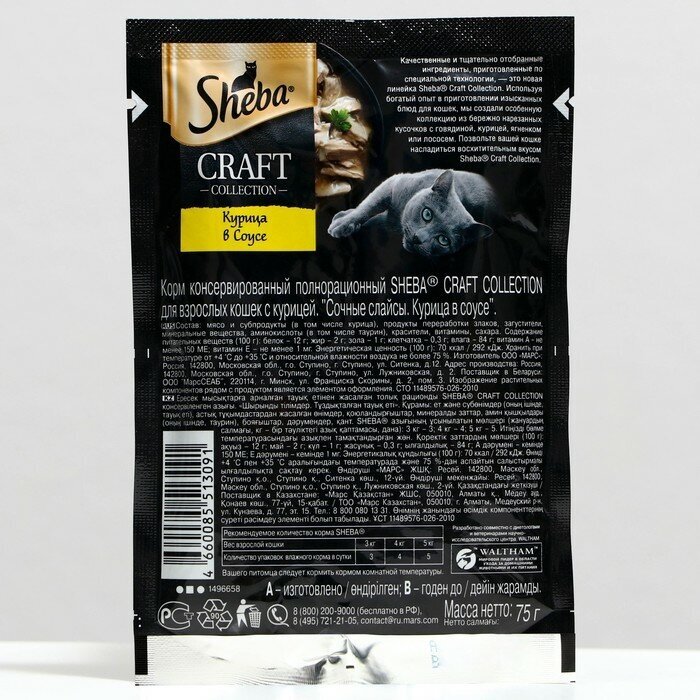 Sheba Влажный корм для кошек (паучи) CRAFT COLLECTION «Сочные слайсы. Курица в соусе» 1023150710244564 0,075 кг 51114 (26 шт)