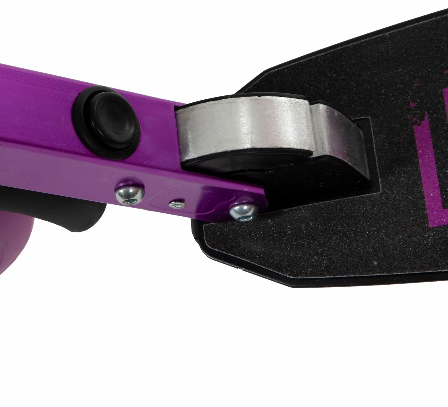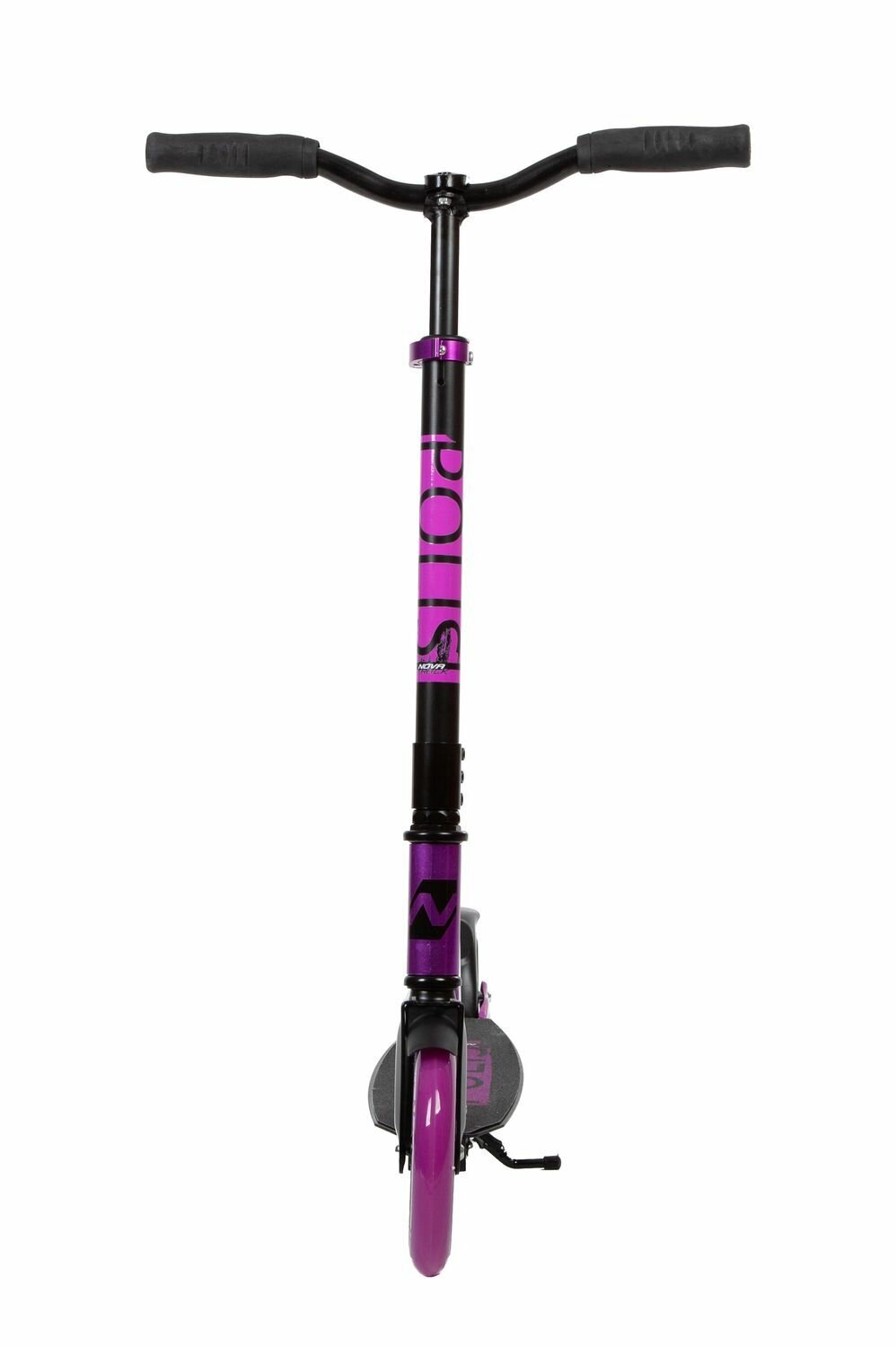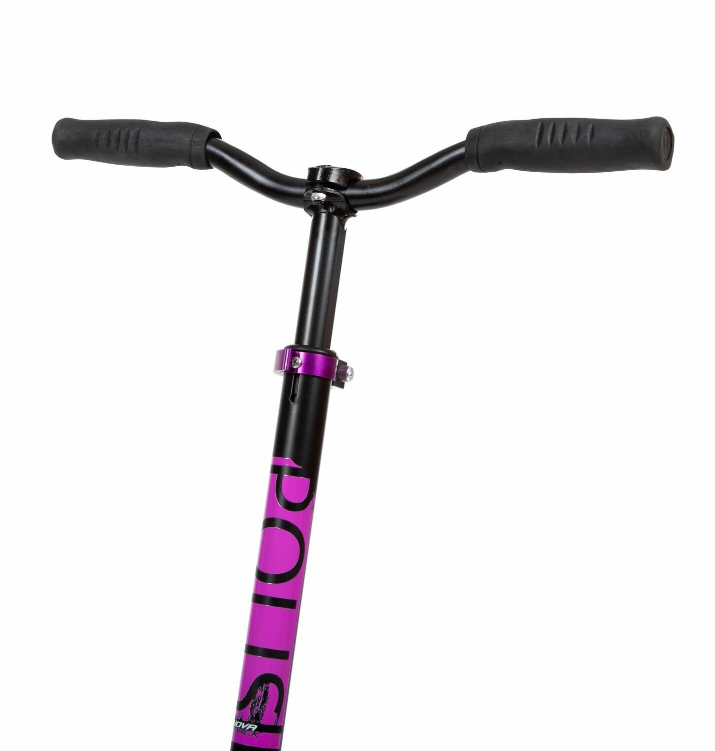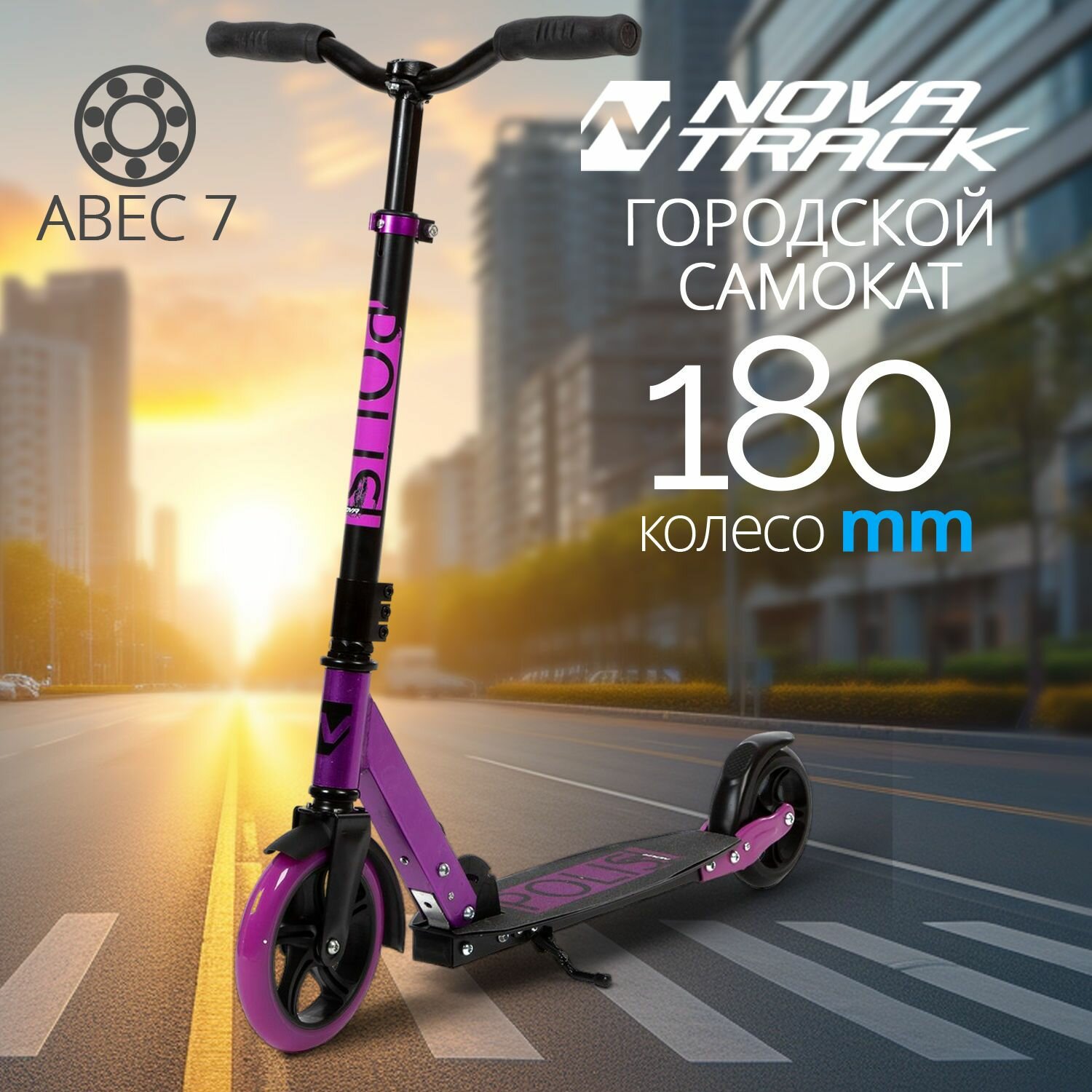 Самокат для детей и подростков NOVATRACK POLIS PRO алюминий, складной с помощью кнопки на раме, эргономичный Y-руль с нескладными рукоятями, колеса PU 180*145мм, фиолетовый