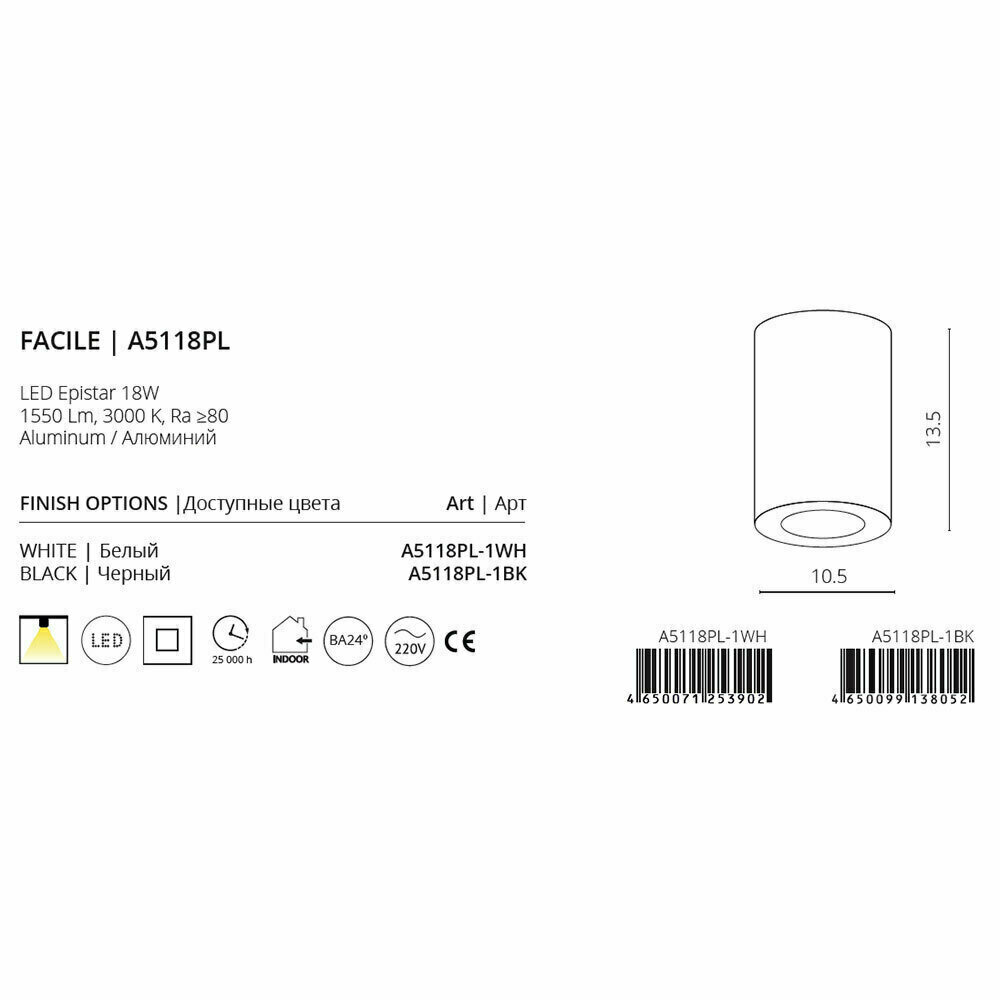 Накладной светильник Arte Lamp Facile A5118PL-1BK, LED, кол-во ламп:1шт., Черный