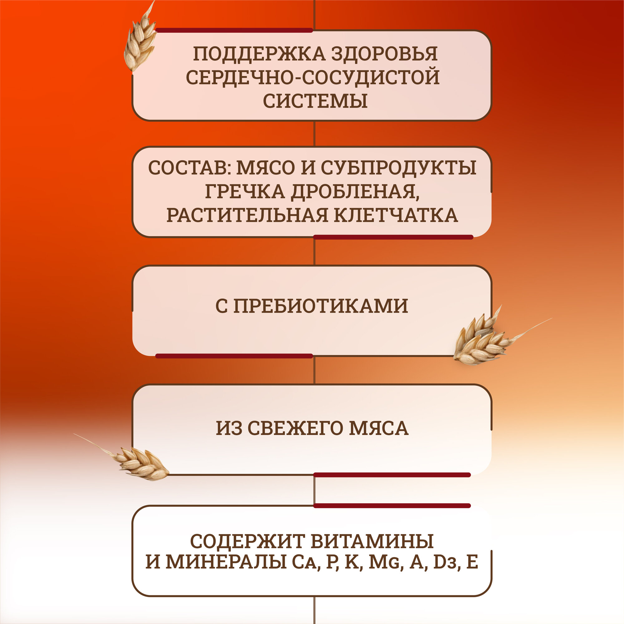| Состав | мясо и субпродукты (в т.ч. баранина не менее 10%, курица не менее 15%, сердце не менее 10%, рубец говяжий не менее 10%), гречка дробленая, растительная клетчатка, витамины минералы |