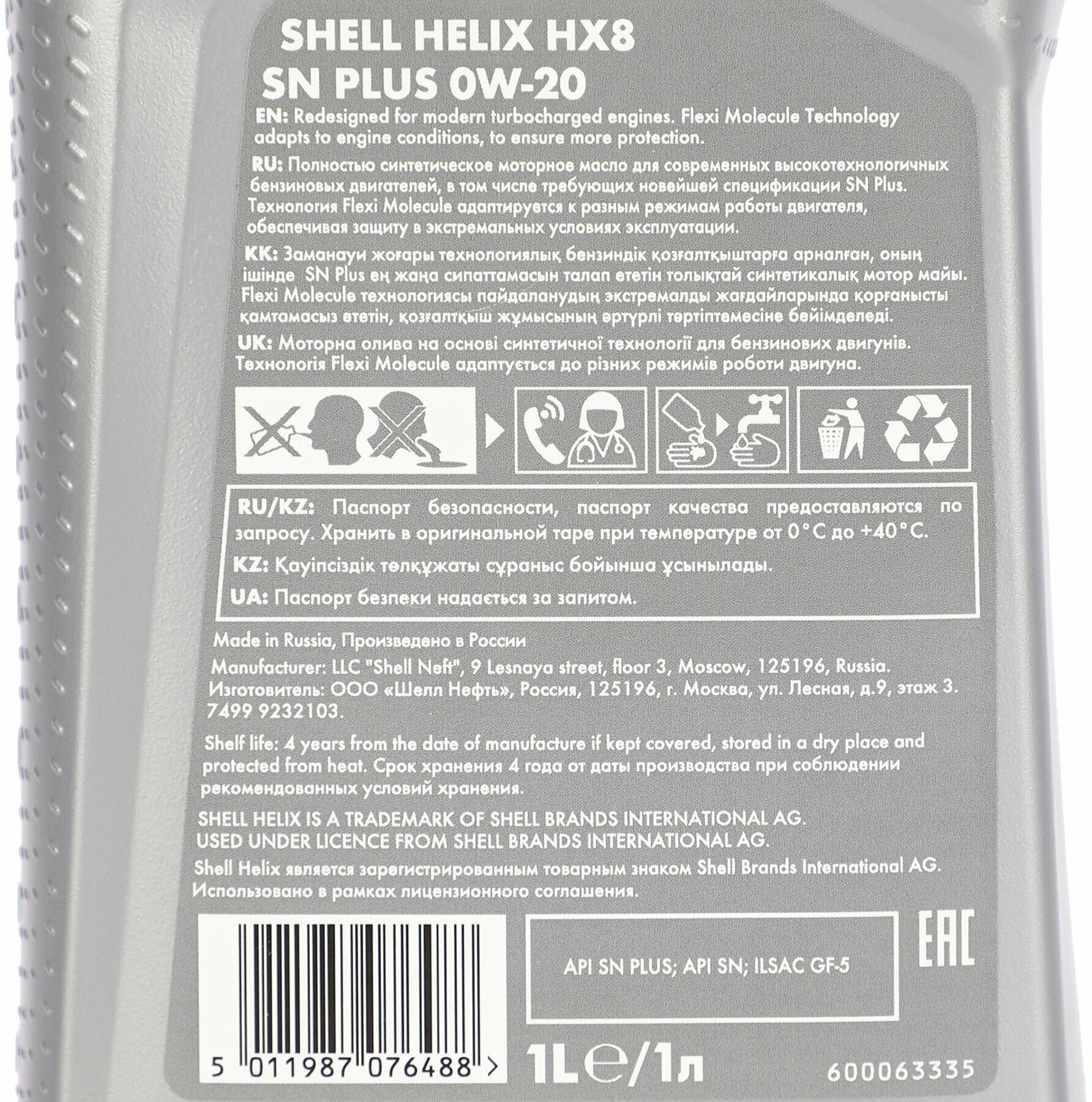 SHELL 550055160 Масо моторное синтетическое 1 . Shell Helix HX8 SN Plus 0W-20, API SN, SN PLUS, ILSAC GF-5