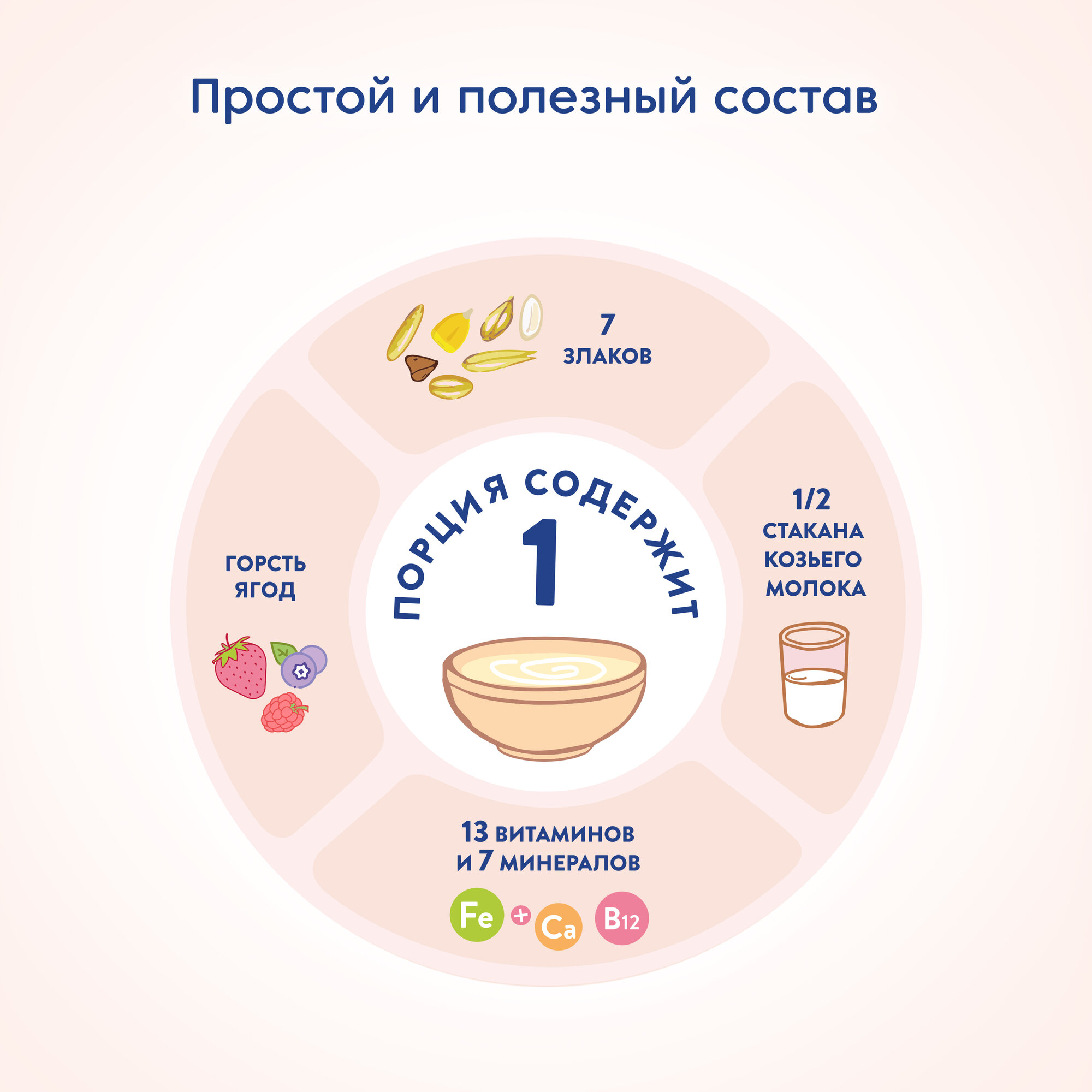 | Состав | крупа (рисовая, пшеничная, кукурузная, гречневая, овсяная, ячменная, ржаная), козье молоко (32%), ягоды (клубника, малина, черника), фруктоза, комплекс минералов (карбонат кальция, пирофосфат железа, йодид калия, сульфат цинка), комплекс витаминов (A, D, E, K, C, B1, B2, B6, B12, ниацин, фолиевая кислота, пантотеновая кислота, биотин) |