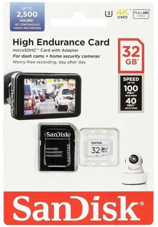 Карта памяти microSDXC SanDisk High Endurance - 32 Гб - высокой прочности для камер 4К UHD - 2.5К часов + адаптер