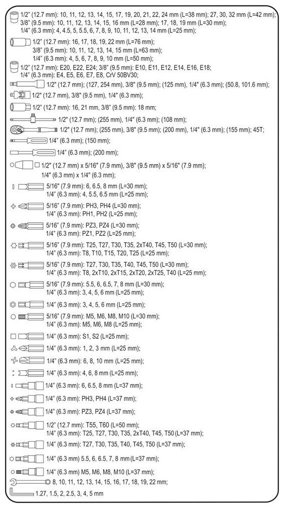 | Головки торцевые подробно | 1/2" (38 мм): 10, 11, 12, 13, 14, 15, 17, 19, 20, 21, 22, 24 мм; 1/2" (42 мм): 27, 30, 32 мм; 3/8" (28 мм): 10, 11, 12, 13, 14, 15, 16 мм; 3/8" (30 мм): 17, 18, 19 мм; 1/4" (25 мм): 4, 4.5, 5, 5.5, 6, 7, 8, 9, 10, 11, 12, 13, 14 мм; длинные 1/2" (76 мм): 16, 17, 18, 19, 22 мм; длинные 3/8" (63 мм): 10, 11, 12, 13, 14, 15 мм; длинные 1/4" (50 мм): 4, 5, 6, 7, 8, 9, 10 мм; удлинитель 1/2": 127, 254 мм; удлинитель 3/8": 125 мм; удлинитель 1/4": 50.8, 101.6 мм; карданный шарнир 1/2", 3/8", 1/4"; свечные 1/2": 16, 21 мм; свечная 3/8": 18 мм; вороток т-образный 1/2": 255 мм; вороток т-образный 1/4": 152.4 мм; трещетка 1/2", 3/8", 1/4": 72 зуба; Torx 1/2": E20, E22, E24; Torx 3/8": E10, E11, E12, E14, E16, E18; Torx 1/4": E4, E5, E6, E7, E8; с битами 1/4": PH1, PH2, PZ1, PZ2, SL4, SL5.5, SL6.5, H3, H4, H5, H6, T8, T10, T15, T20, T25, TX8, TX10 (2 шт), TX15 (2 шт), TX20 (2 шт), TX25 (2 шт), TX40; с битами 1/2": T55, T60 |