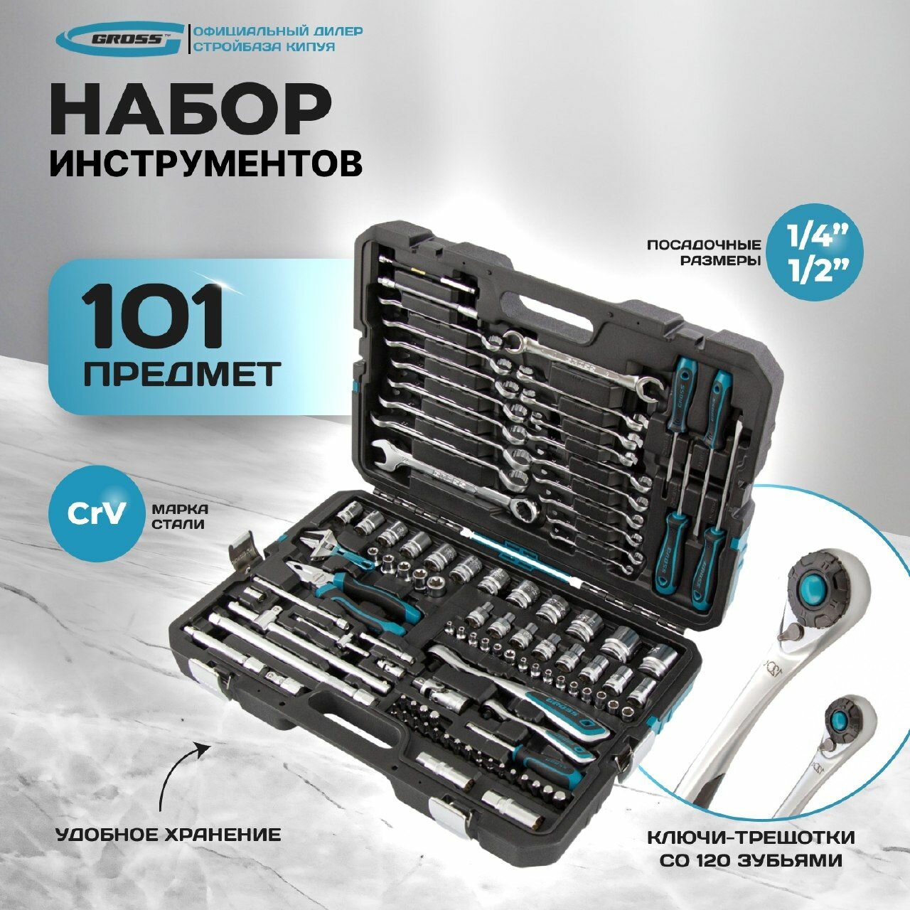 Купить Набор инструментов, 1/4", 1/2", CrV, 120 зубьев, 101 предмет Gross
