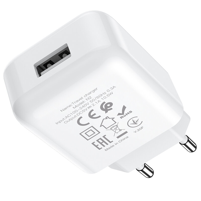 Сетевое зарядное устройство Hoco N2, 1хUSB, 2 А, кабель Lightning, 1 м, белое