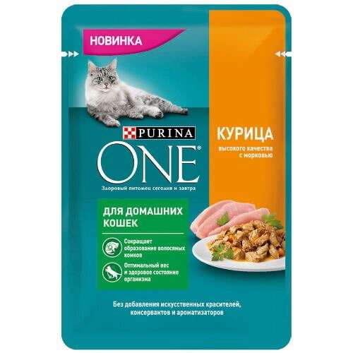 Купить PURINA ONE для взрослых кошек живущих дома с курицей и морковью (75 гр х 26 шт)