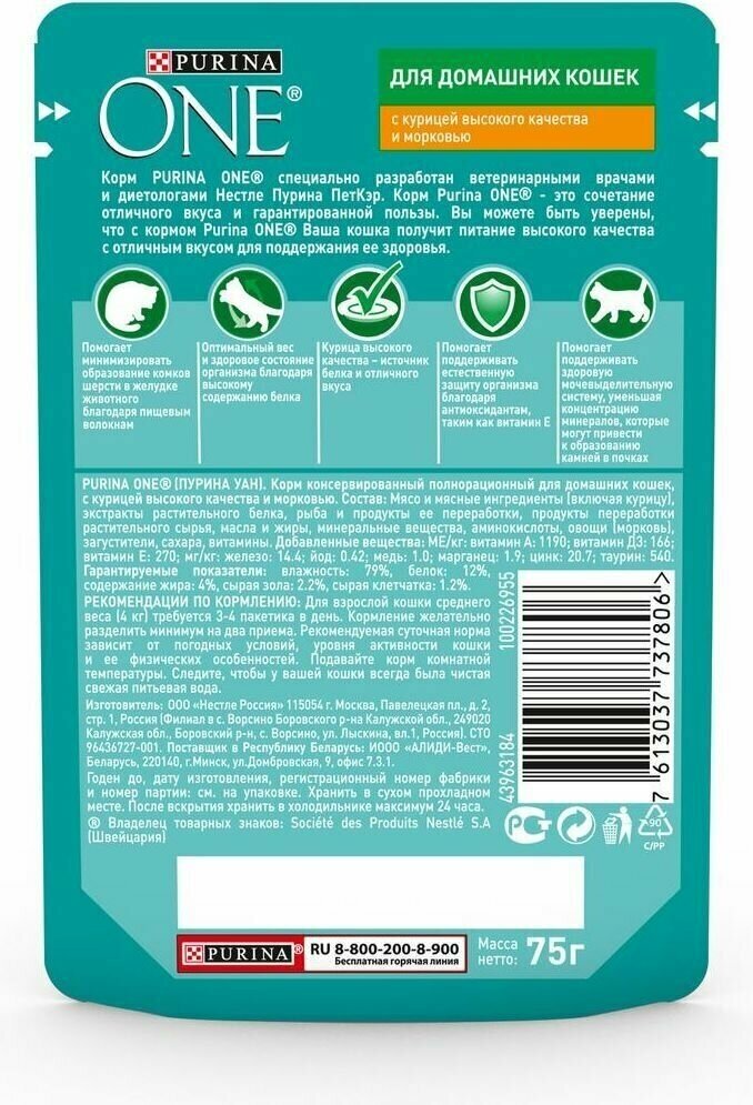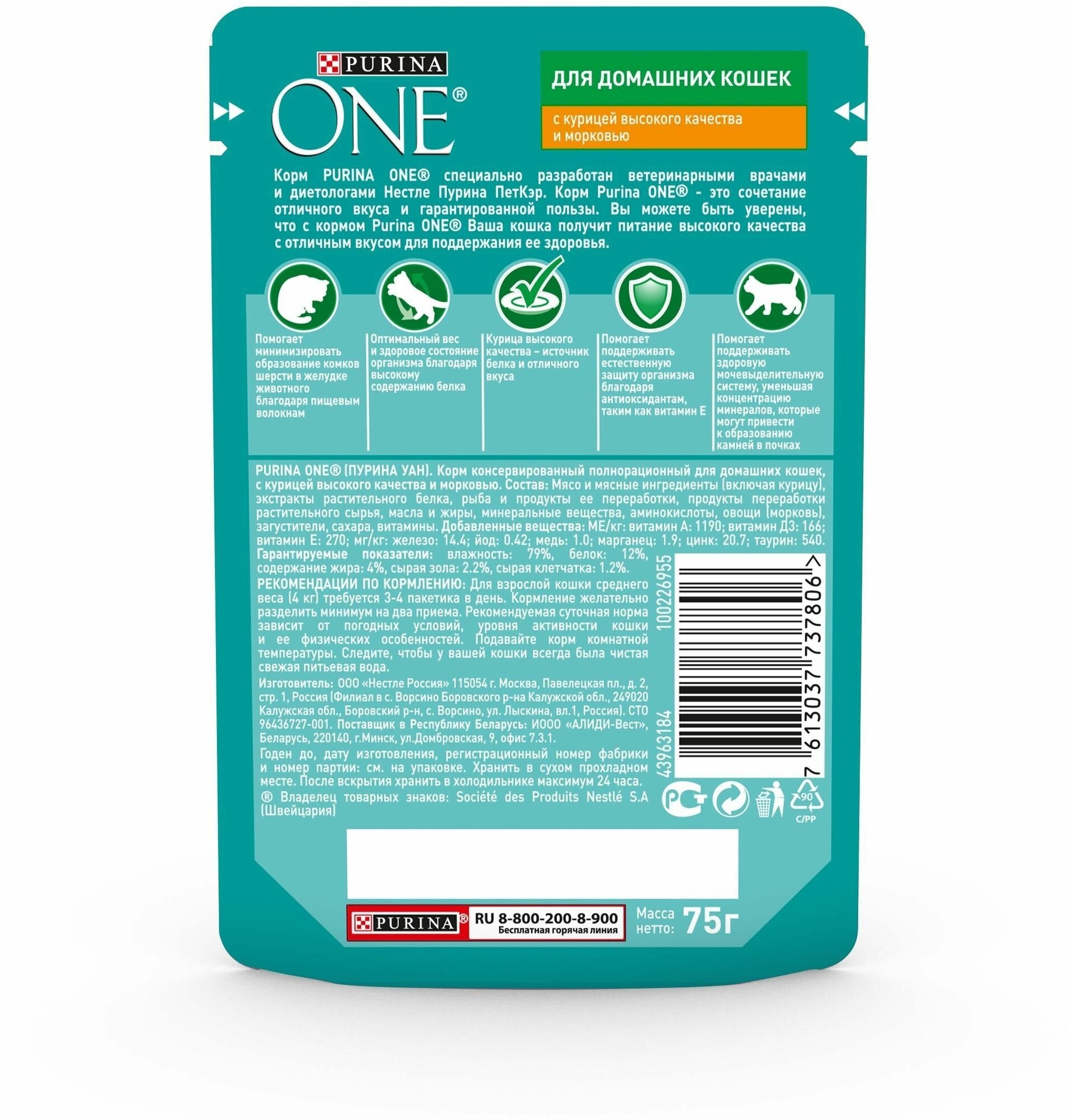 Влажный корм Purina ONE для домашних кошек, с курицей и морковью, Пауч, 75 г*26 шт