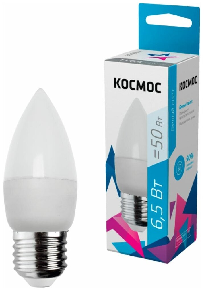 Лампочки светодиодные Космос Свечка 6,5Вт Е27 (аналог 50Вт) Нейтральный белый свет, 1 шт.