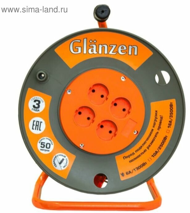 Удлинитель на катушке Glanzen EB-50-006, 4 розетки, б/з, 16А / 3500 Вт красный 50 м 1.5 м² 4