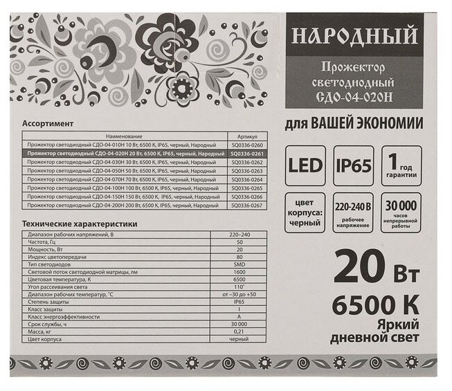 Прожектор светодиодный, TDM, Народный СДО-04-020Н, 20 Вт, 6500 К, IP65, бел, SQ0336-0271