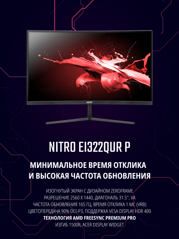 Монитор 32" Acer Nitro EI322QURPbmiippx Black (VA, изогнутый, 2560x1440, 165Hz, 1 ms, 178°/178°, 400 cd/m, 100M:1, +2xD)