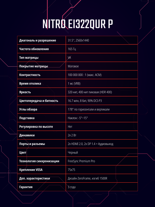 31.5" Монитор Acer Nitro EI322QURPbmiippx, черный (2560x1440, 165 Гц, VA, LED)
