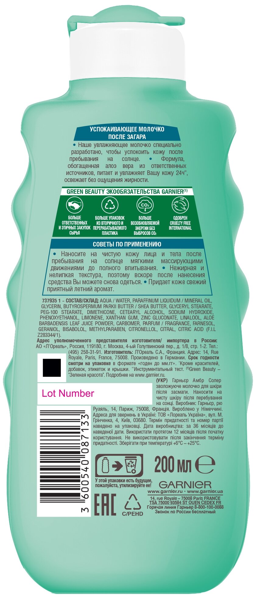 GARNIER AMBRE SOLAIRE. Успокаивающее молочко после загара для лица и тела с алоэ вера, 200 мл