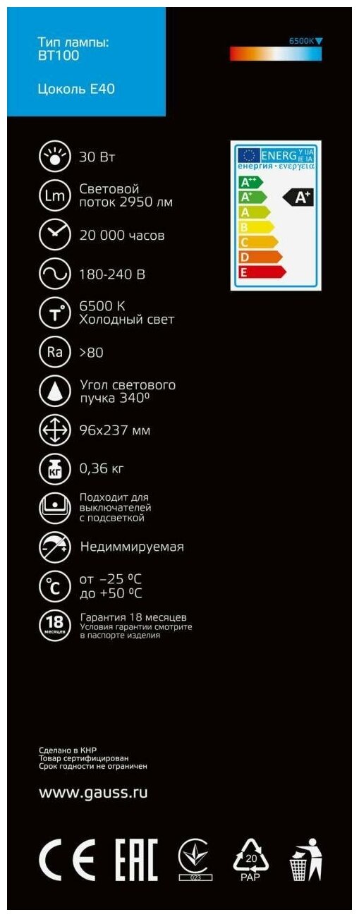 Лампа Gauss Basic BT100, AC180-240V, 30W, 2950lm, 6500K, E40, LED 11834332