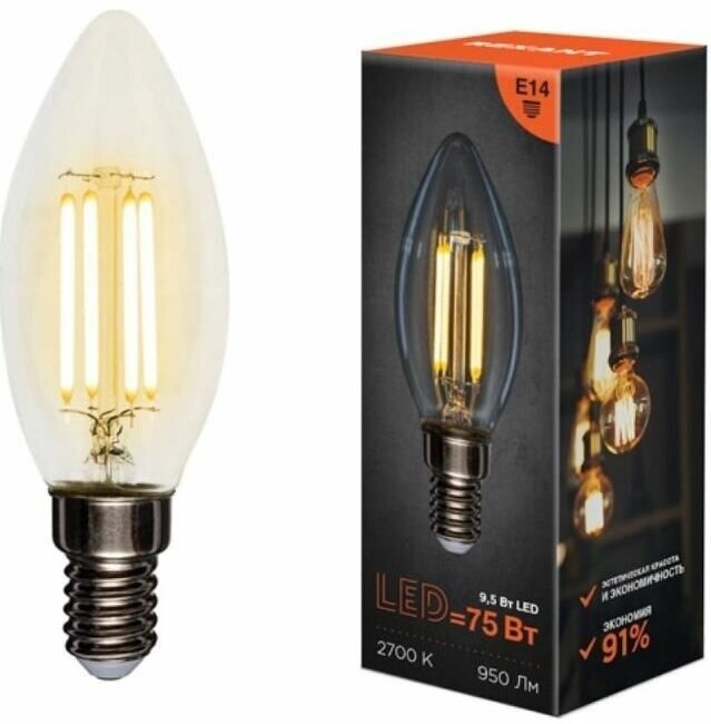 Лампа филаментная REXANT Свеча CN35 9.5 Вт 950 Лм 2700K E14 прозрачная колба Артикул 604-091 (10_шт)