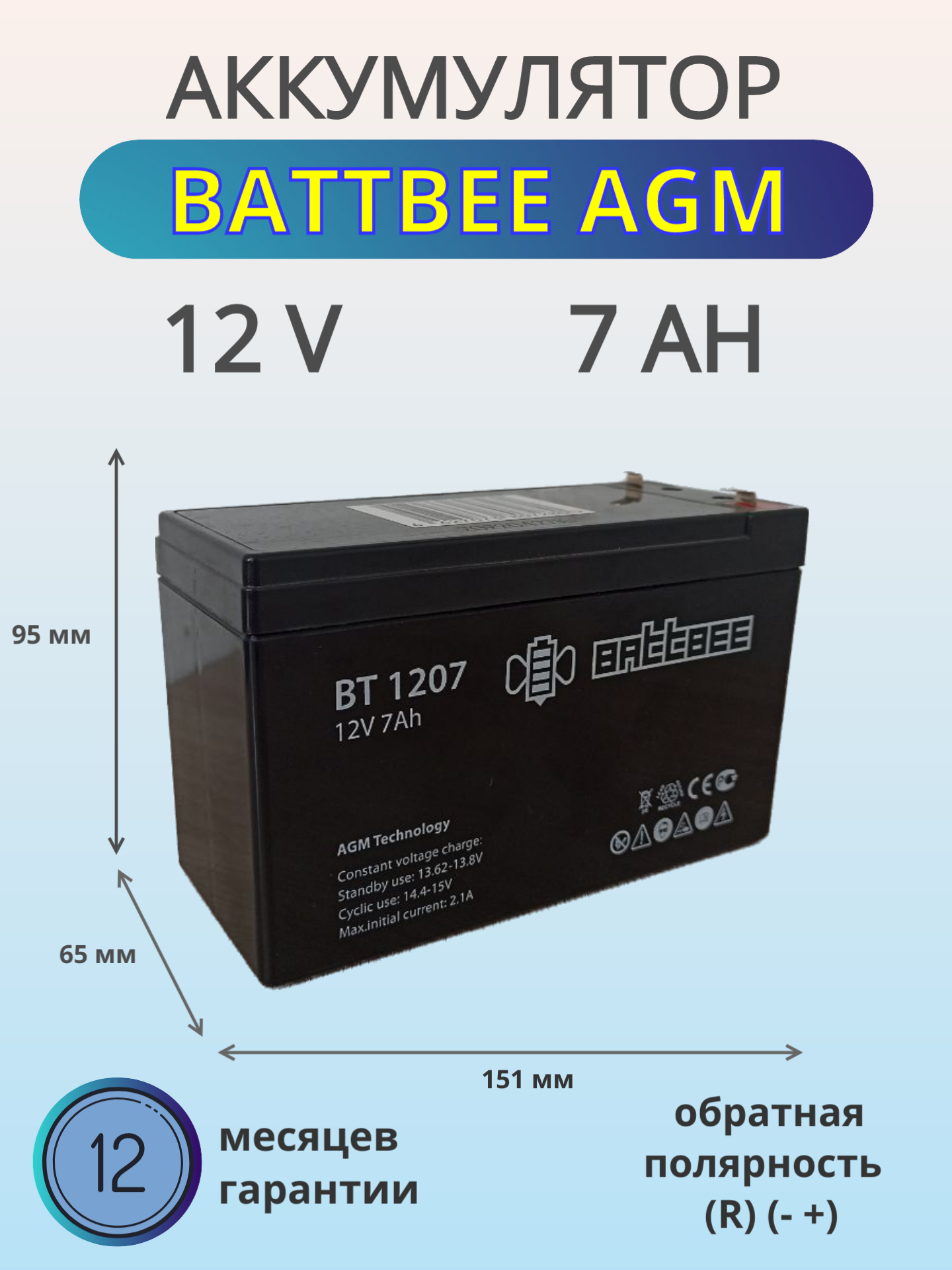 Аккумуляторная батарея Battbee BT 1207 12 В 7 Ач для ИБП,UPS, аккумулятор для детского электромобиля, эхолота