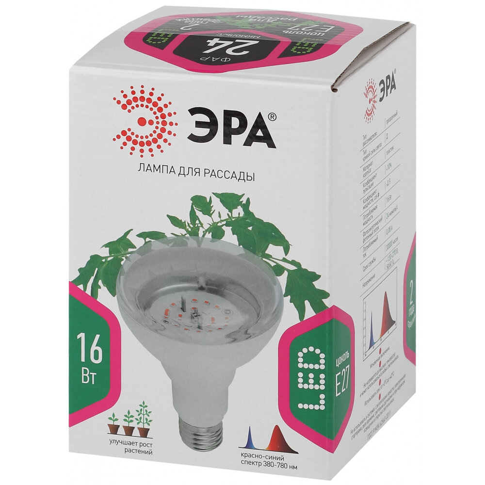Фитолампа для растений светодиодная ЭРА FITO-16W-RB-E27-K красно-синего спектра (цветен, плоды) R63 Е27 16Вт 24 мкмоль/с 380...780нм 1300К 230В (Б0039072)