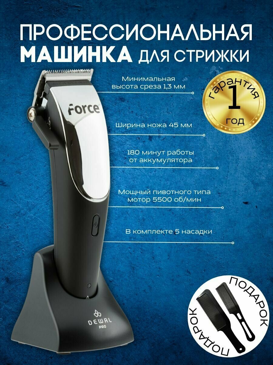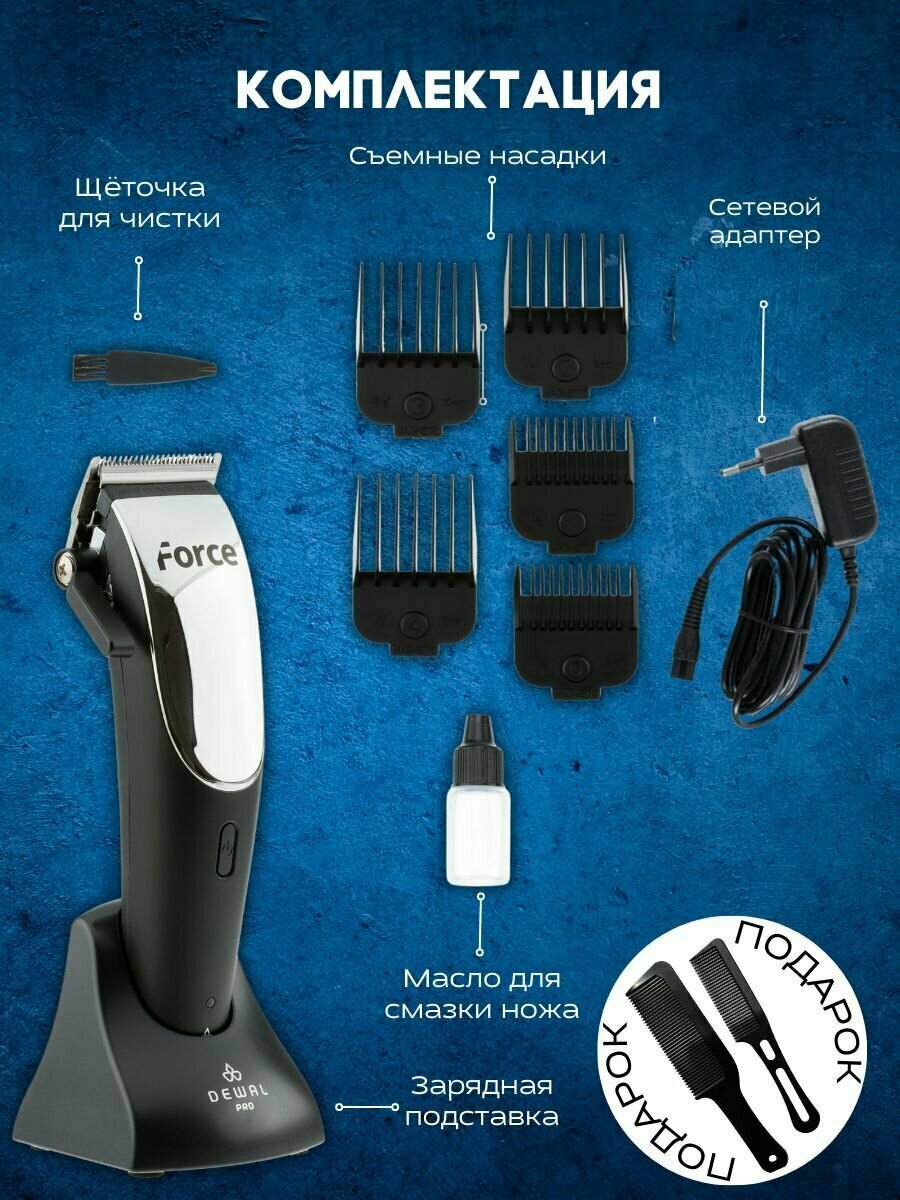Машинка для стрижки DEWAL FORCE, аккумуляторно-сетевая, нож 45 мм, 1-3,3 мм, 5 насадок