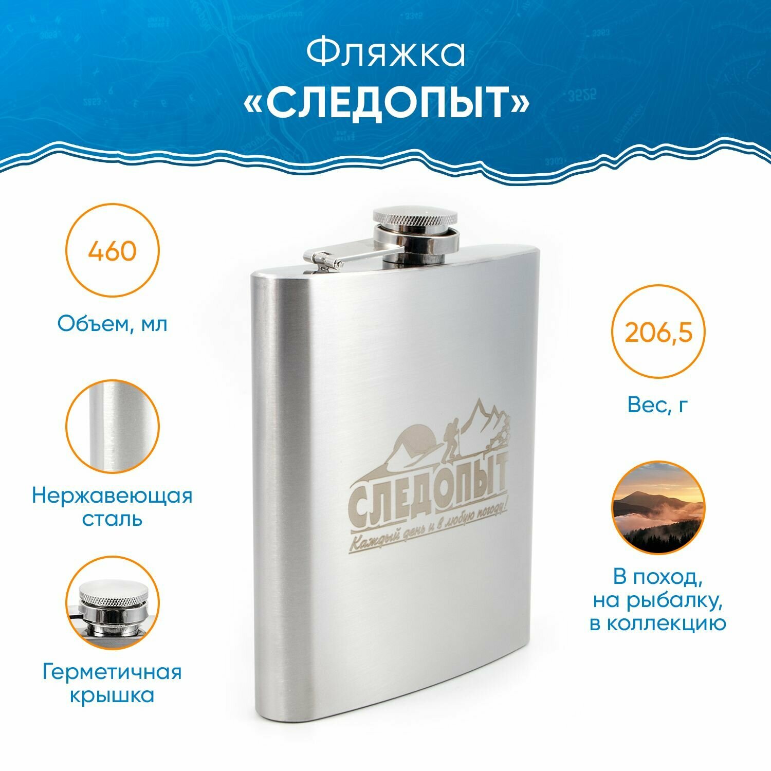 Фляжка для алкоголя стальная плоская "следопыт", 460 мл / Фляга походная подарочная