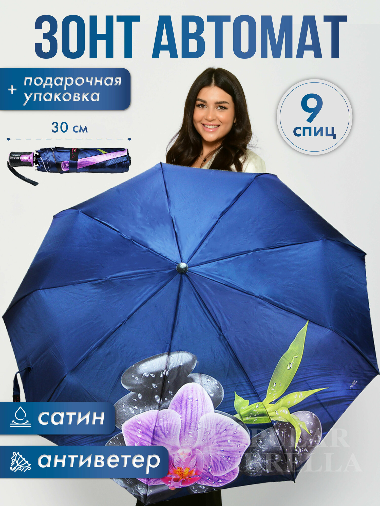 Зонт женский автомат, зонтик взрослый складной антиветер 1296/Берлинская-лазурь