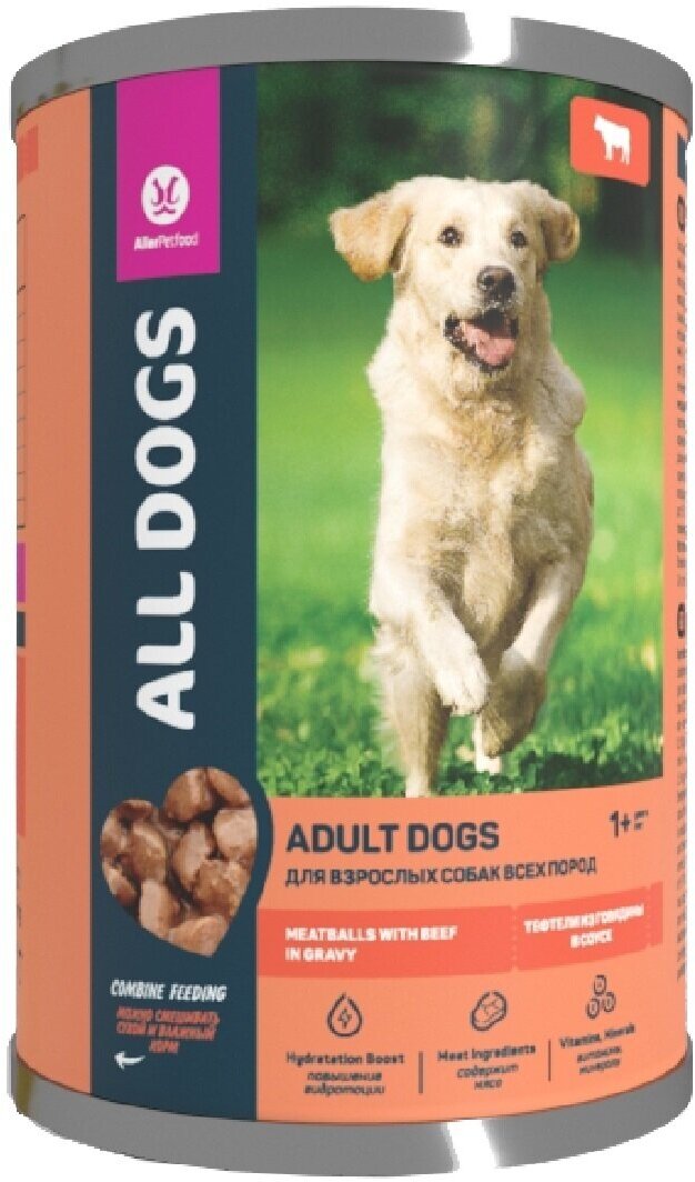 Влажный корм All dogs для собак, тефтельки с говядиной в соусе, банка,415 г