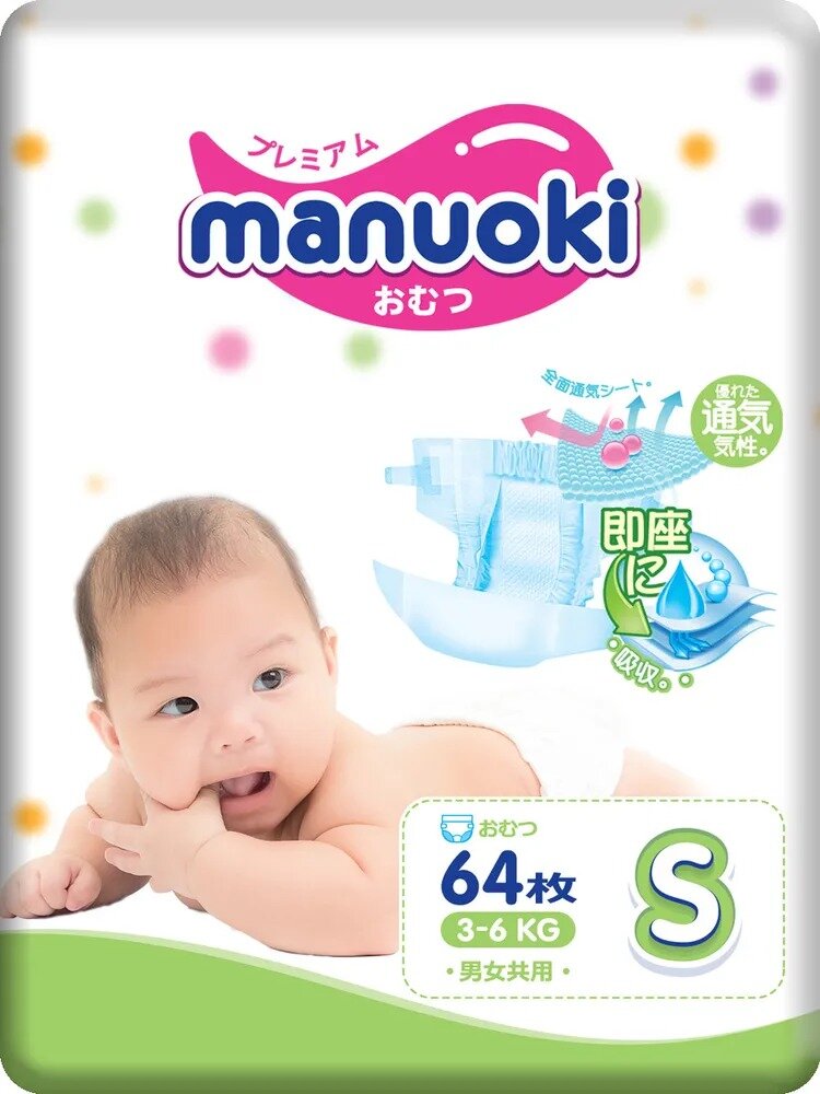 Подгузники Manuoki S (3-6 кг) 64 шт