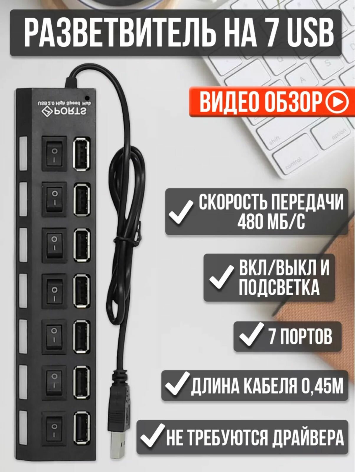 USB-концентратор на 7 разъемов с выключателями