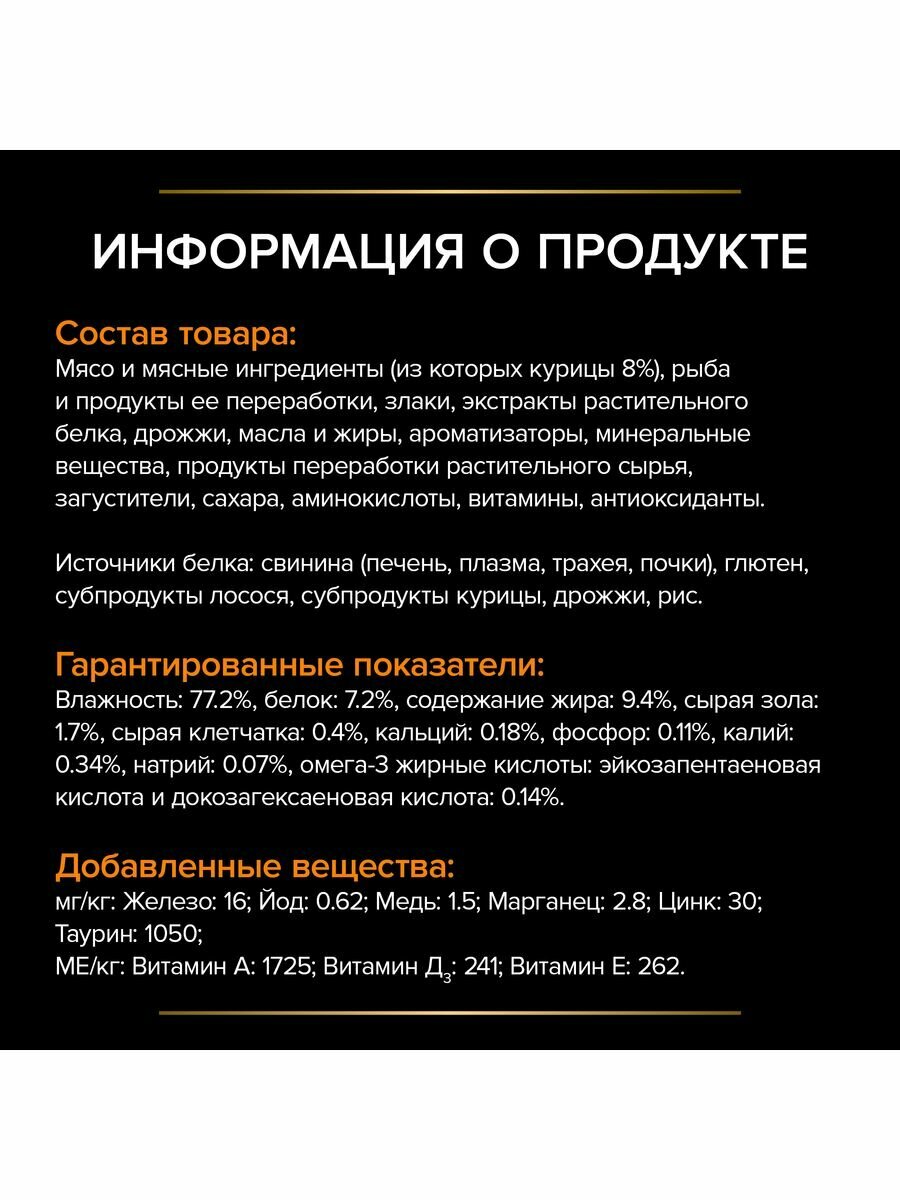| Состав | мясо и мясные ингредиенты (из которых курицы 8%), рыба и продукты ее переработки, злаки, экстракты растительного белка, дрожжи, масла и жиры, ароматизаторы, минеральные вещества, продукты переработки растительного сырья, загустители, сахара, аминокислоты, витамины, антиоксиданты. Источники белка: куриные субпродукты, свинина (почки, трахея, печень, плазма), глютен, рис, дрожжи, субпродукты из лосося. |