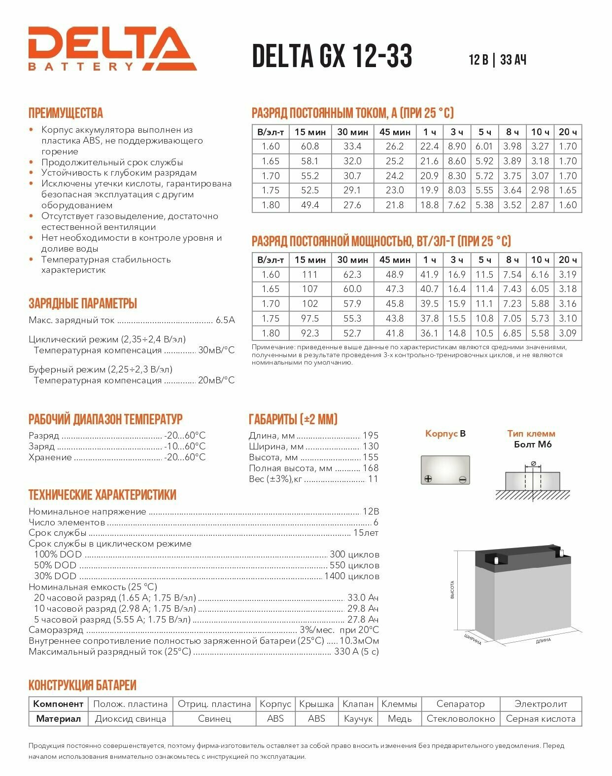 | Дополнительная информация | Аккумулятор Delta GX 12-33 полностью герметизирован, утечка из него электролита (кислоты) невозможна. Поэтому его можно транспортировать и использовать в любом удобном положении (вертикальном или горизонтальном). У батареи GX 12-33 отсутствуют ограничения на перевозку по автомобильным дорогам, по воздуху, по морю и по железной дороге |