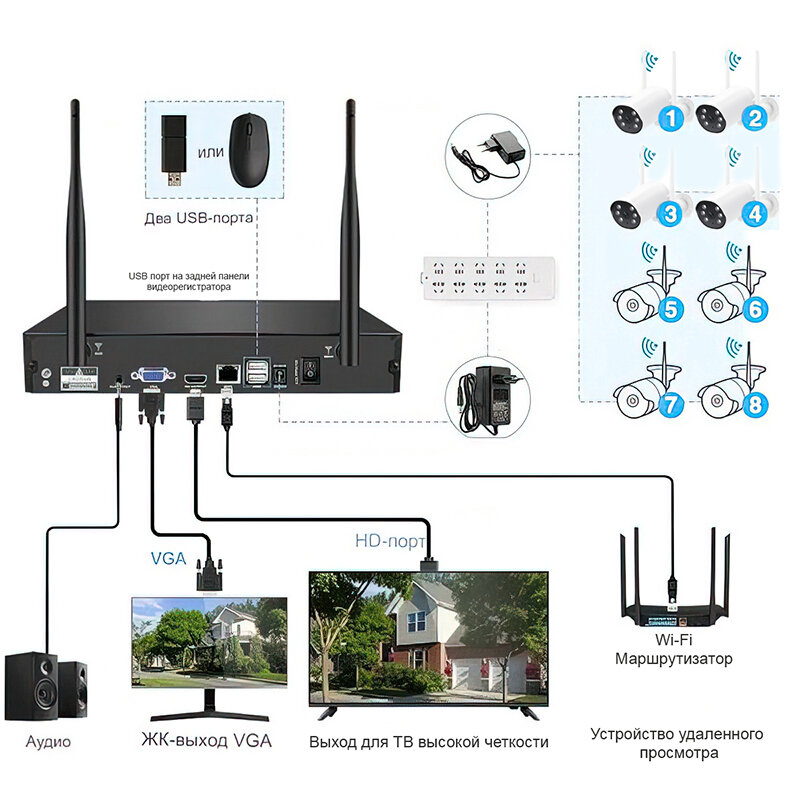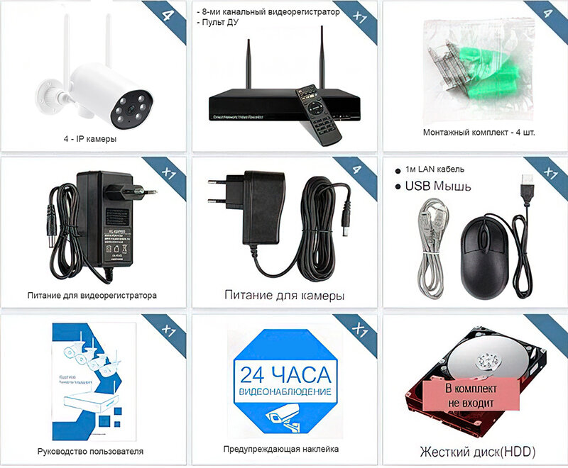 | Подробная комплектация | 1 - H.265 8CH 3MP Беспроводной NVR WiFi; 4 - 3MP WI-FI камеры; 1 - Блок питания для NVR 220-12B; 4 - Адаптер для камеры 220-12B; 1 - 1 м Lan кабель для NVR; 1 - USB мышь; 1 - Монтажный комплект; 1 - Пульт дистанционного управления; 2 - Предупреждающая наклейка; Упаковка. |