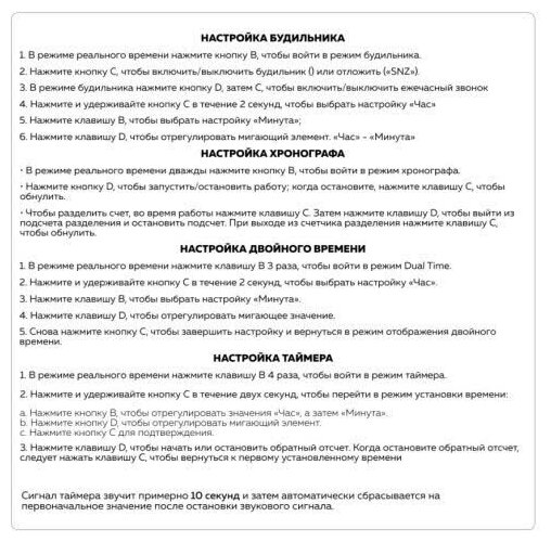 | Отзыв: | Часы за 700 руб. оправдали мои ожидания. Ни чено лишнего, все настройки как в инструкции. Прислали часы черные, хотя в заказе указаны с синей полосой. Подсветка работает, кнопки не заедают. Корпус массивный и увесистый. |