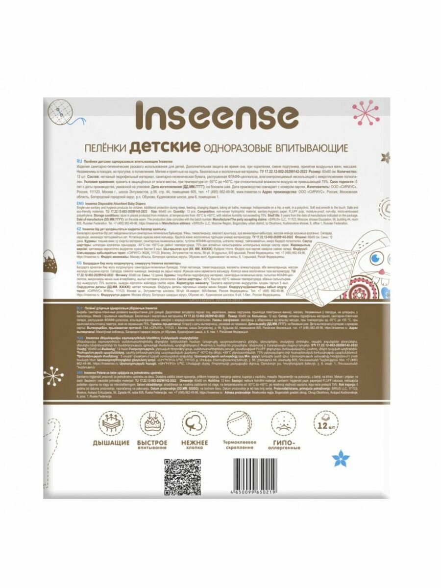 Пеленки INSEENSE детские впитывающие одноразовые 60х60 12 шт