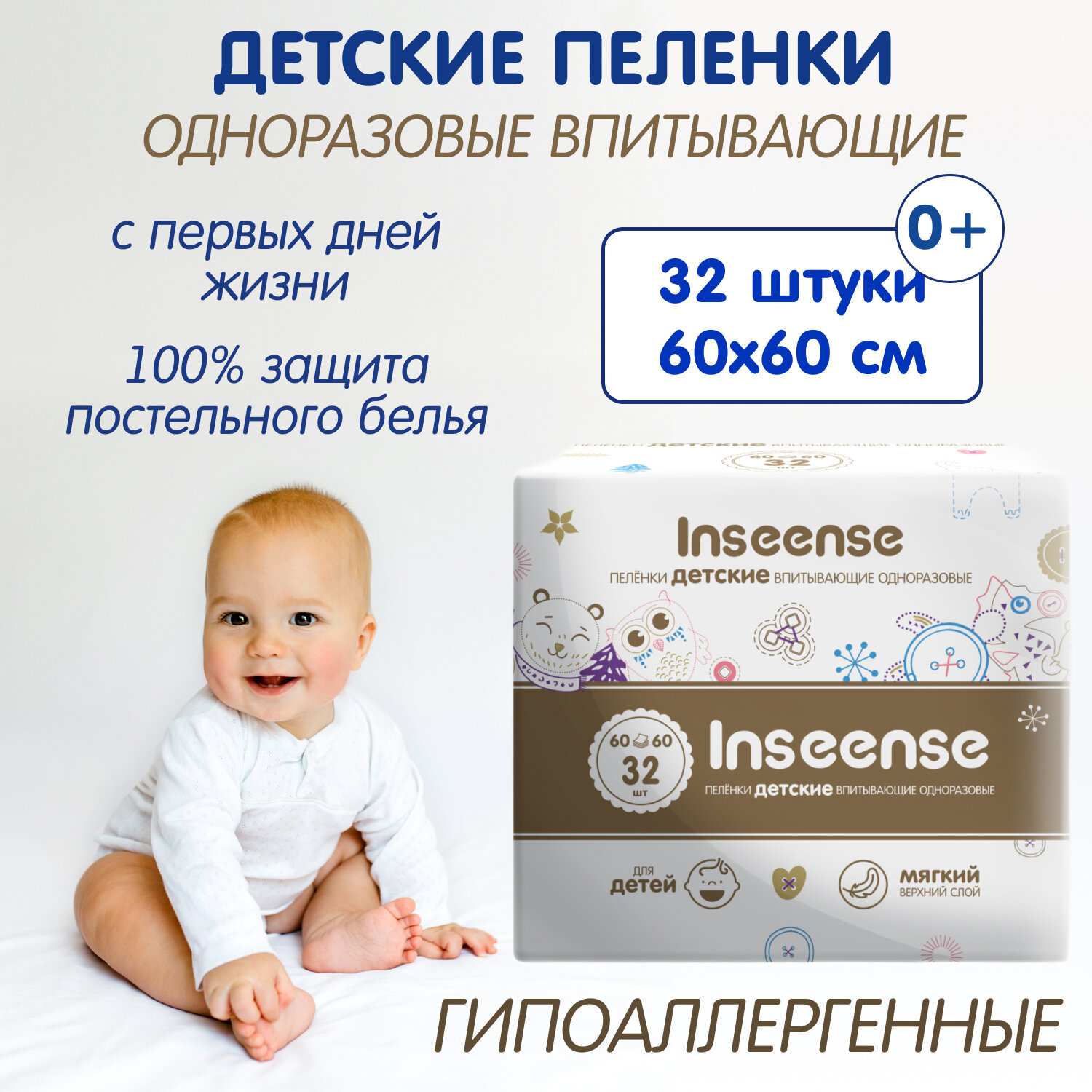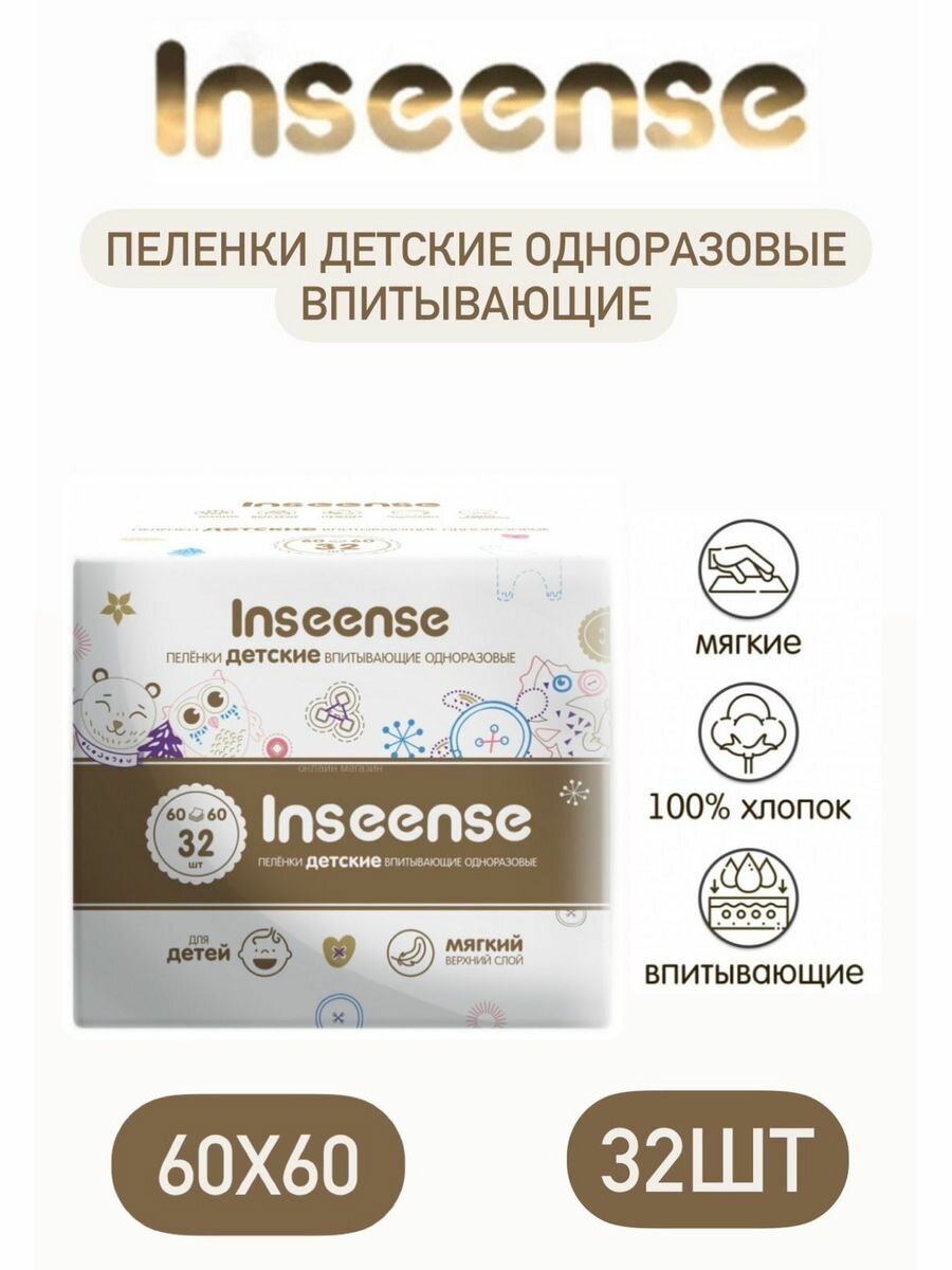 Купить INSEENSE Пеленки детские одноразовые 60х60, 32 шт Ins6632 650226