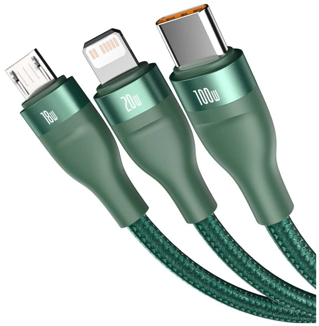 Купить Кабель BASEUS Flash Series Two-for-three, U+C to MicroUSB 18W + Type-C 100W + Lightning 20W, 1,2м, Зеленый, CA2T3-06