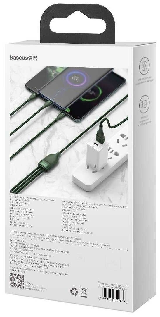 Кабель Baseus 3in1 USB , USB Type C USB Type C Lightning micro USB 5 A 100 Вт, 20 Вт, 18 Вт 1,2 м Power Delivery Quick Charge, Green (CA2T3-06)