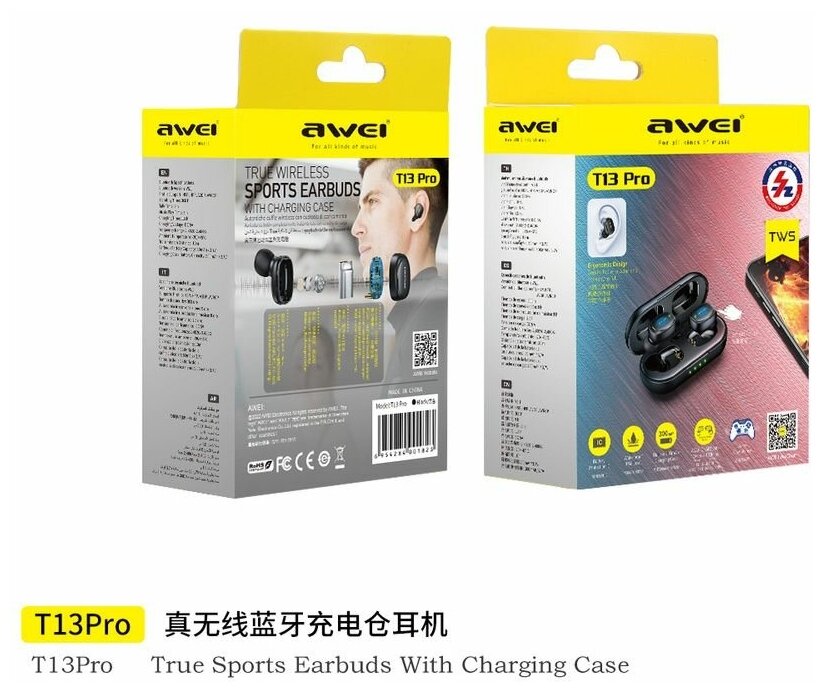 | Комплектация | Bluetooth наушники Awei T13 pro-1шт. Сменные силиконовые амбушюры -2 шт. Шнур для зарядки бокса -1шт. Зарядный футляр - 1шт. Упаковка, инструкция - 1шт. |