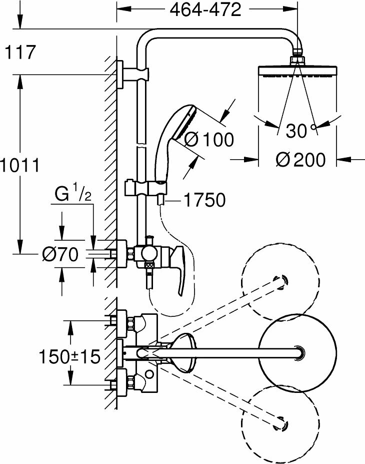 | Дополнительная информация | высота стойки для душа 1128 мм; диаметр душевой лейки 100 мм; диаметр верхнего душа 200 мм; два режима лейки: Rain и Jet |
