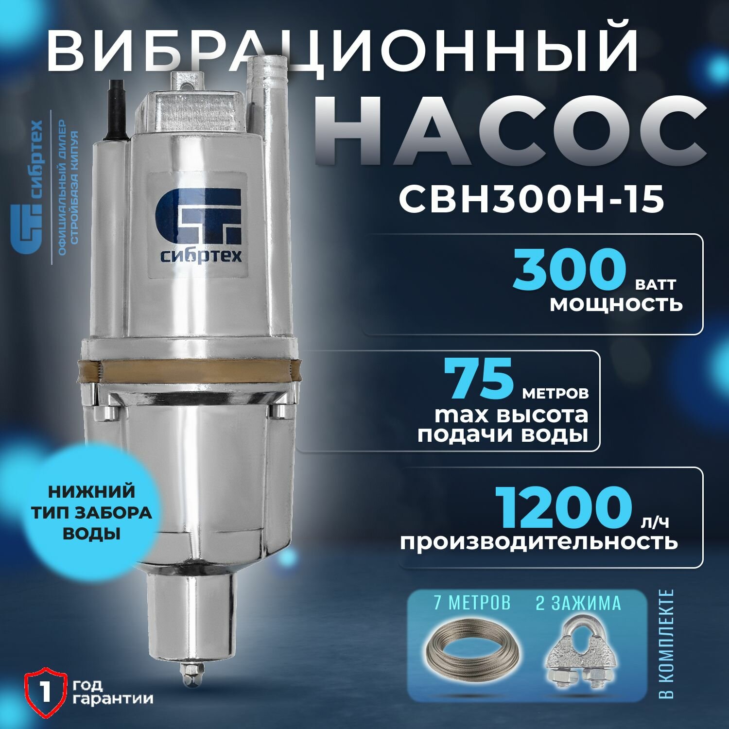 Вибрационный насос СВН300Н-15, нижний забор, 300 Вт, напор 75 м, 1200 л/ч, кабель 15 м Сибртех