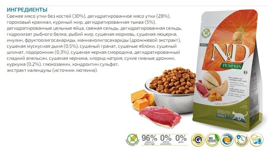 Купить Farmina N&D Cat Pumpkin Duck&Cantalupe Adult корм для взрослых кошек Утка, тыква и дыня, 1,5 кг.