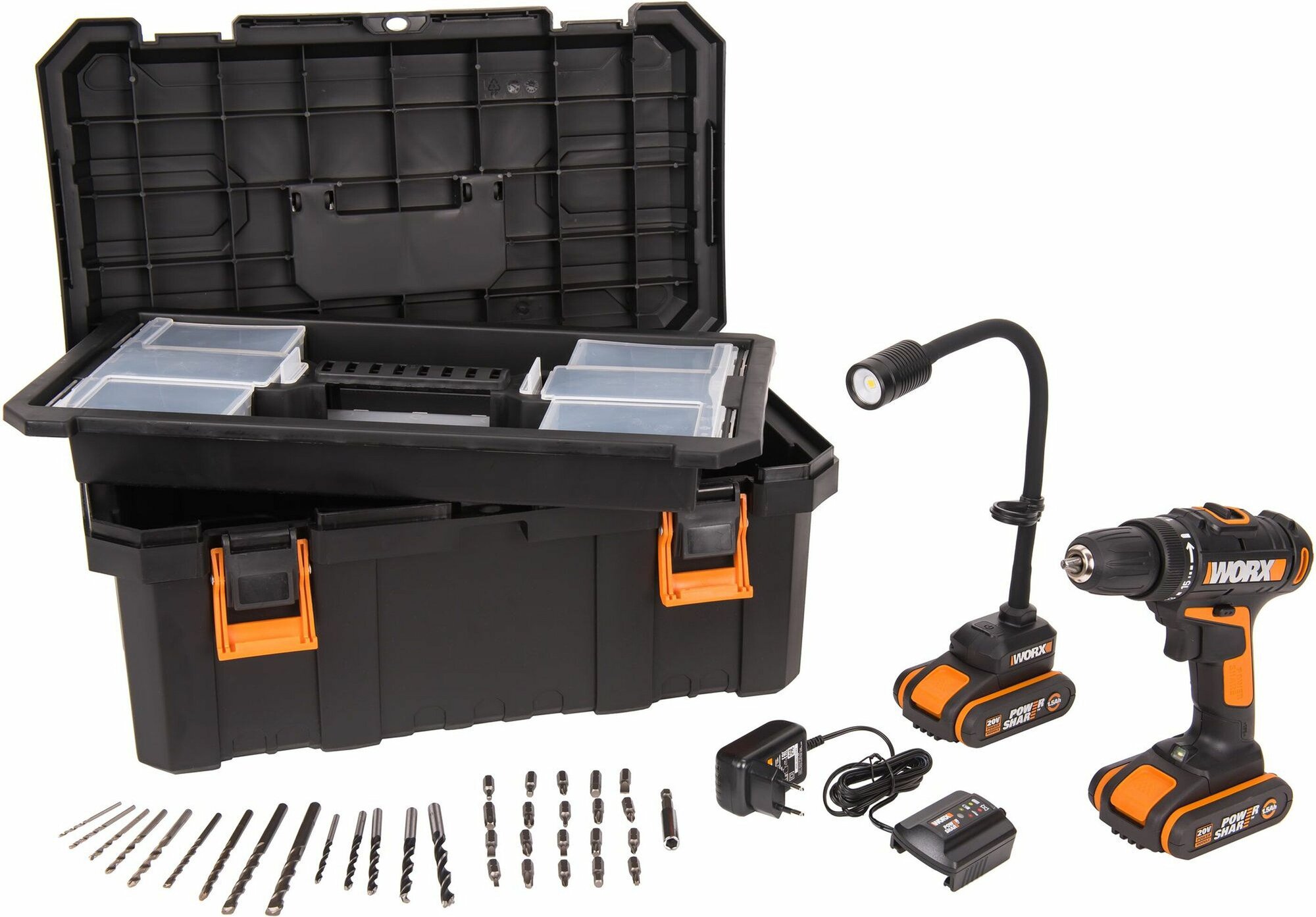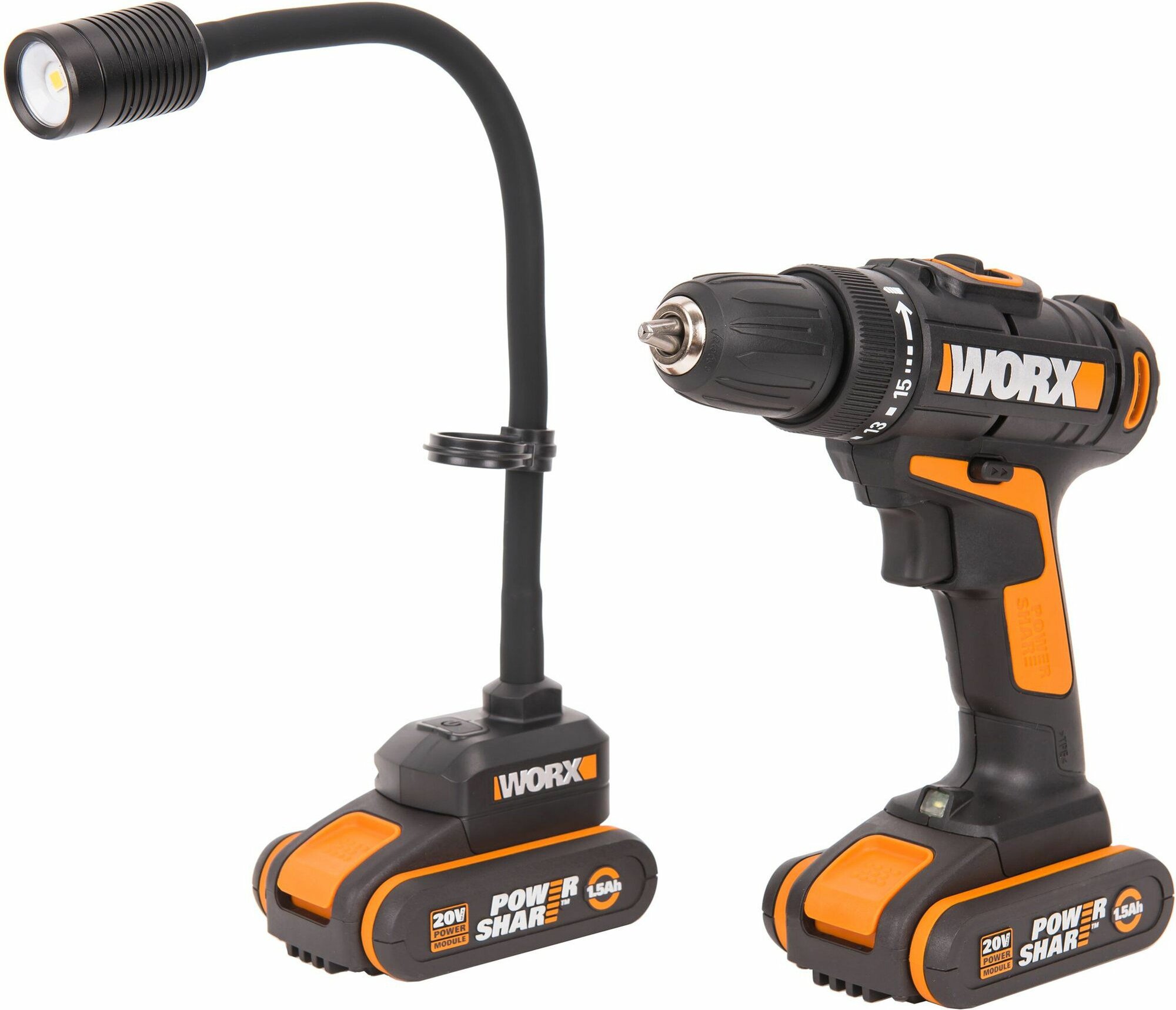 Дрель-шуруповерт аккумуляторная WORX WX977: WX101 + Фонарь аккумуляторный WX028