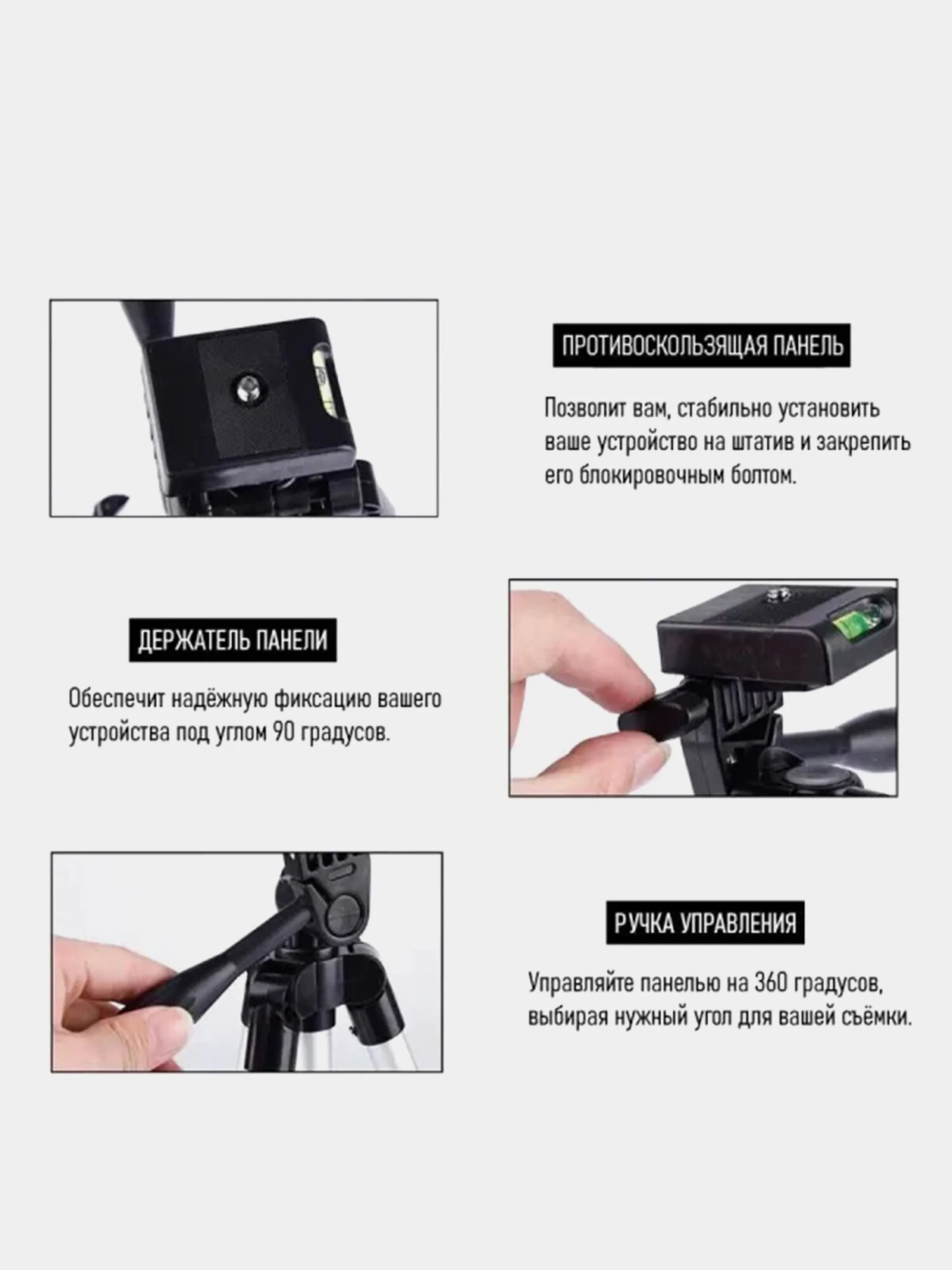 | Дополнительная информация | Совместимость:смартфоны,кольцевая лампа,видеокамера, камера.Комплектация чехол; штатив для смартфона; Штатив для кольцевой лампы; штатив для фотоаппарата; штатив для камеры; Штатив Tripod 3110 высота 1.02 м |
