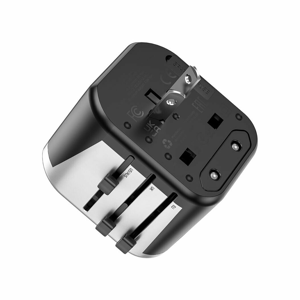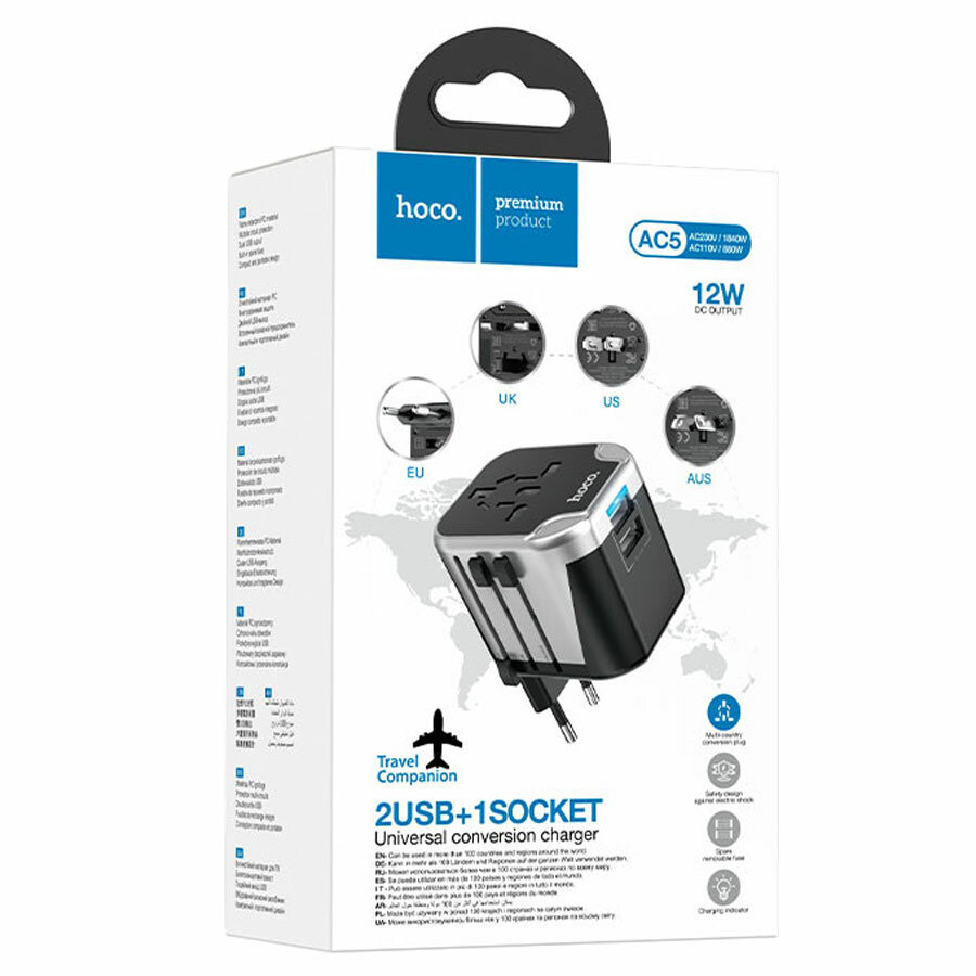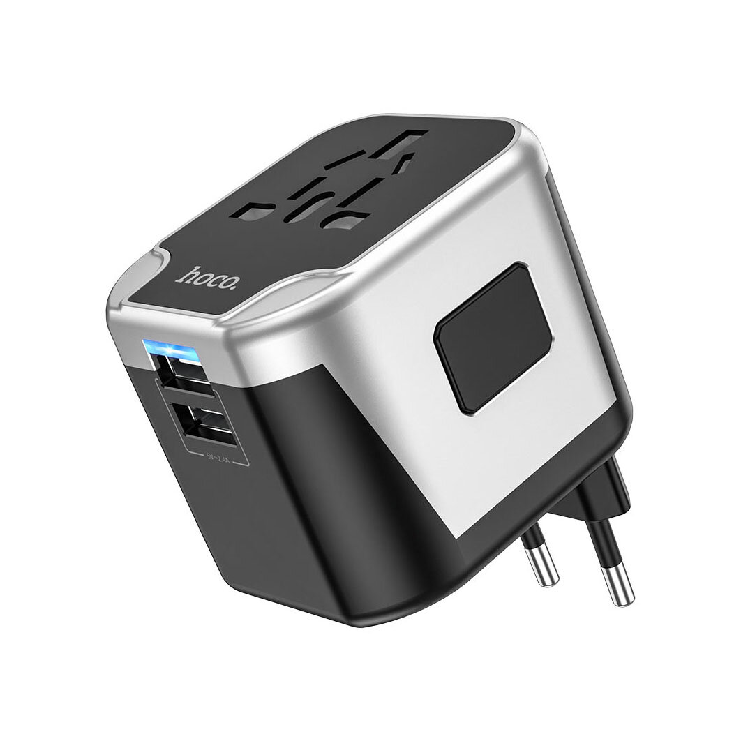 Зарядное устройство для всех стран мира Hoco AC5 Travel Companion, 2USB+1розетка, Черный+Серебристый
