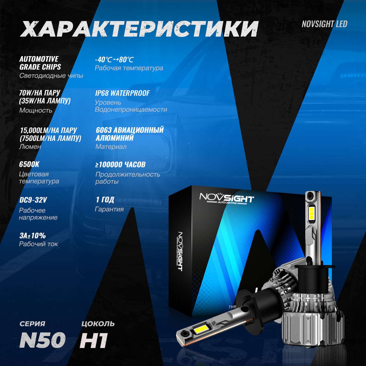 Светодиодная лампа Novsight N50 H1 цоколь P14,5s 70Вт 2шт 15000Лм 6500К белый свет LED автомобильная интересное: