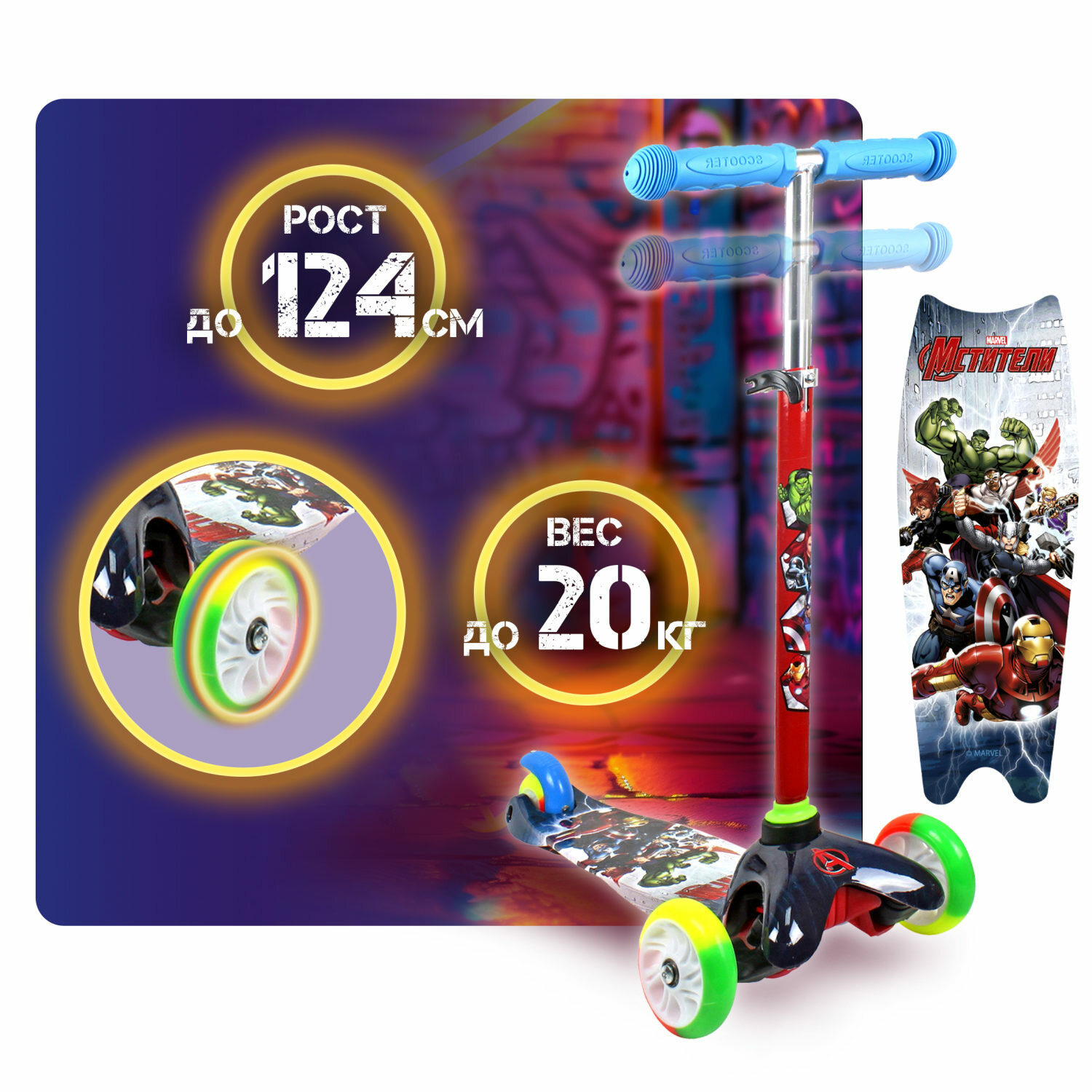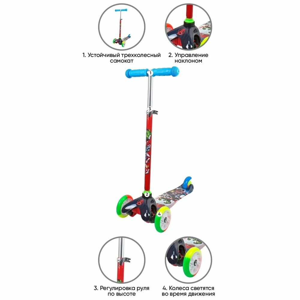 Самокат детский Marvel Мстители, трехколесный, кикборд, со светящимися колесами