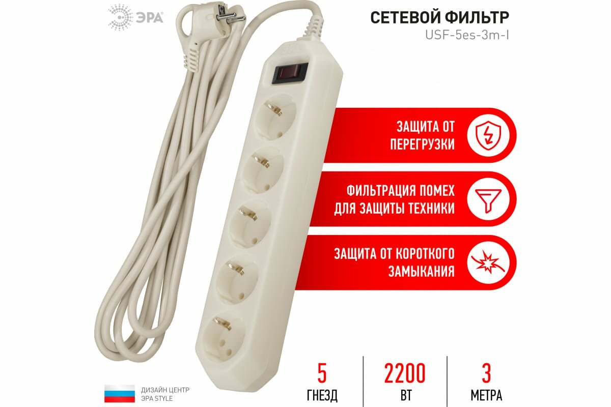 Сетевой фильтр ЭРА USF-5es-I (Б0019035), 5 розеток, с/з, 10А / 2200 Вт бежевый 3 м 0.75 м² 5
