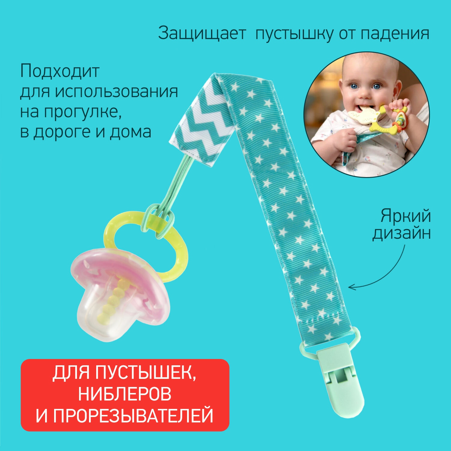 Держатель для пустышек "Минт". Ткань. Материал держателя -полиэстер, АБС-пластик