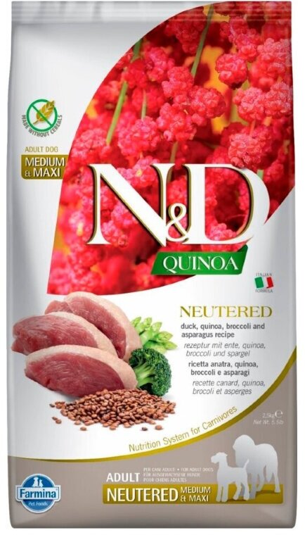 Сухой корм Farmina N&D Quinoa Duck, Broccoli & Asparagus Neutered Adult Medium&Maxi, для взрослых стерилизованных/кастрированных собак средних и крупных пород, беззерновой, утка, киноа, брокколи, аспарагус, 2,5 кг