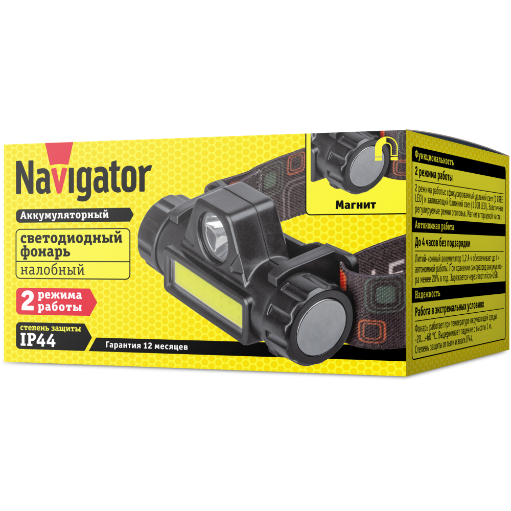 Фонарь налобный Navigator 14 661 NPT-H25, 2 режима работы, аккум. Li-ion 1200 мА/ч