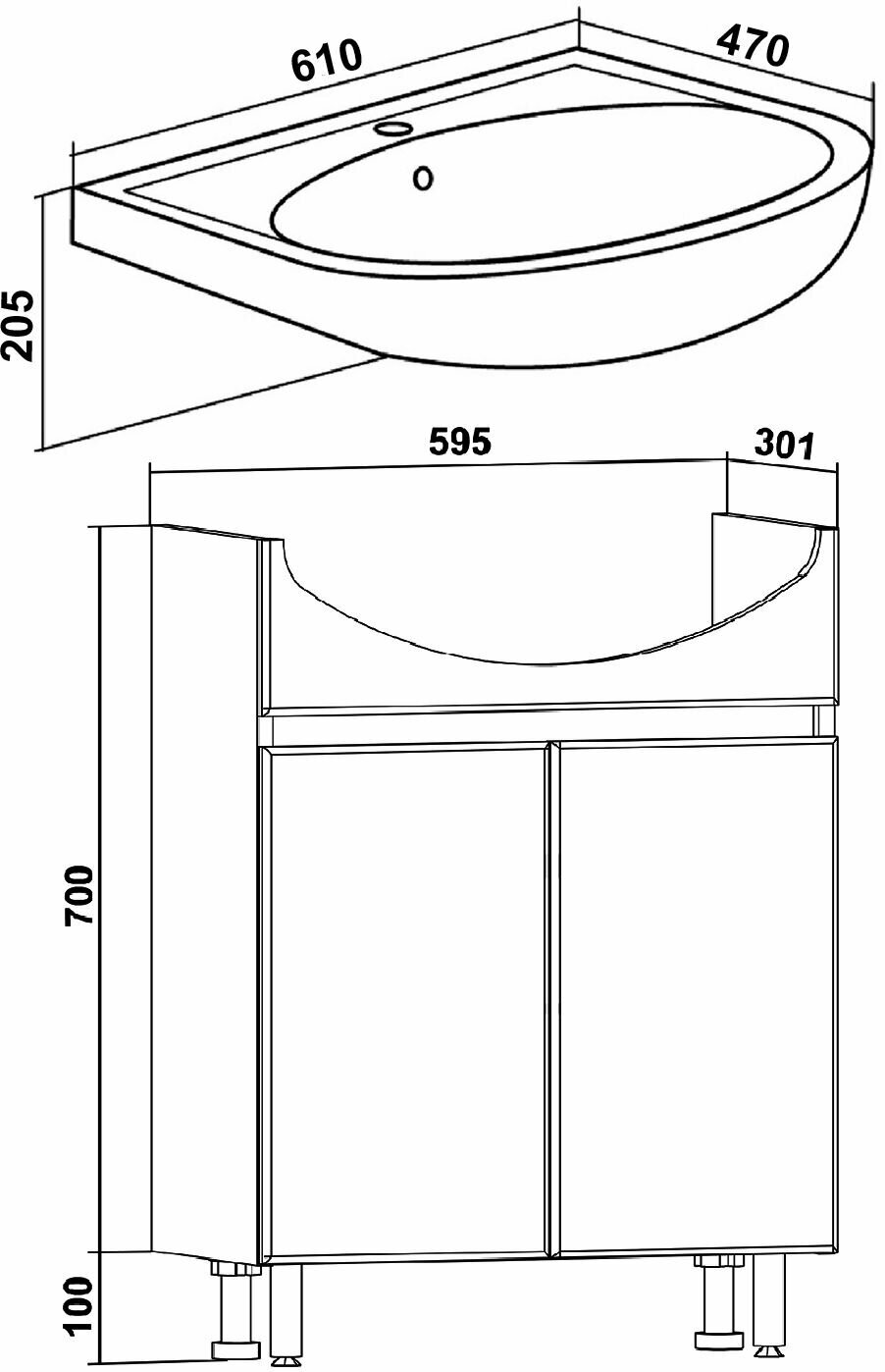 | Комплектация | тумба под раковину, петли со встроенным доводчиком, одна ручка, 2 хромированные и 2 пластиковые ножки |